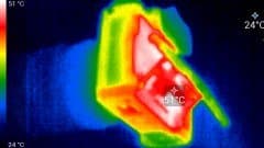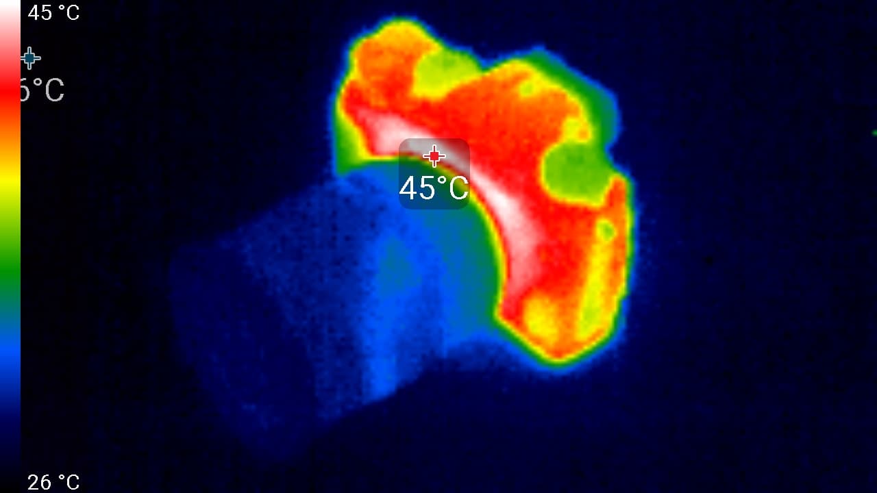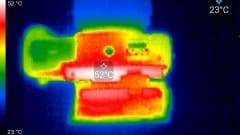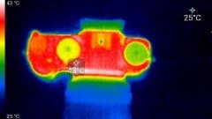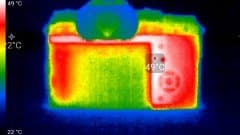 Первый практический тест касается нагрева аппарата. Этот фактор совершенно некритичен для фотографов, однако мучительно волнует видеооператоров. Теперь интересно увидеть, насколько сильно нагревается камера при работе. во время беспрерывной видеозаписи. Следующие теплоснимки были сделаны во время долгой работы камеры с секундными перерывами на остановку и включение, которая в течение 30 минут производилась в помещении с температурой около 25 °C.