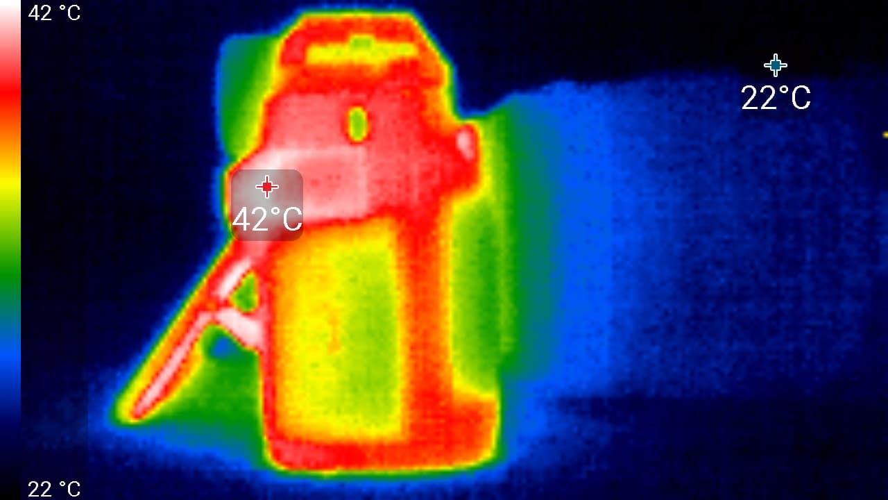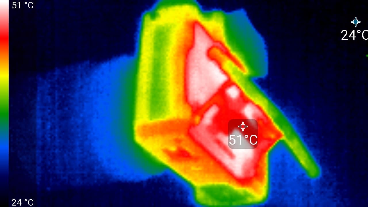 Наибольшая температура наблюдается на участке корпуса, который расположен под откидным экраном. Здесь корпус нагревается до 52 °C. Предыдущая модель камеры давала нагрев примерно в этой же области корпуса, но значительно меньший — 44 °C. Вот она, первая очевидная разница между моделями. Новый сенсор, новый процессор — они не только более производительные, но и более горячие. Впрочем, эти 52 °C — цифра неопасная, мы видывали гаджеты и погорячее.