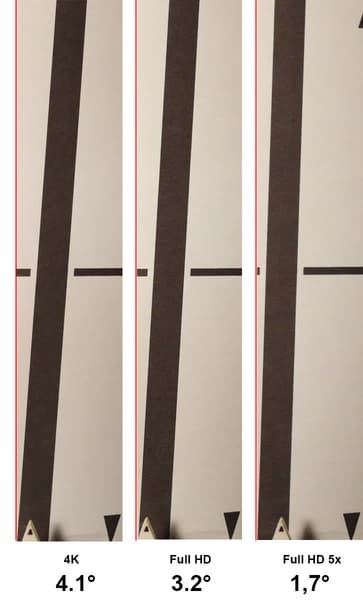 Изучим роллинг-шаттер (подробнее см. в материале Роллинг-шаттер в видеосъемке — описание дефекта, примеры, пояснения). Первое его проявление — это наклон вертикалей. Его несложно определить с помощью нашего специального стенда, в котором на вращающемся с постоянной скоростью (78 об/мин) цилиндре нанесена вертикальная метка. Измерение показало, что в рассматриваемой камере роллинг-шаттер дает максимальный наклон в 4,1° в режиме съемки 4K 60p. При пониженной частоте кадров, 30p, наклон чуть увеличивается, до 5,2°. В режиме Full HD наклон — а значит, и уровень роллинг-шаттера — снижается до 3,2°. Отдельного внимания удостоился скоростной режим съемки, в котором наклон падает до практически незаметных 1,7°.