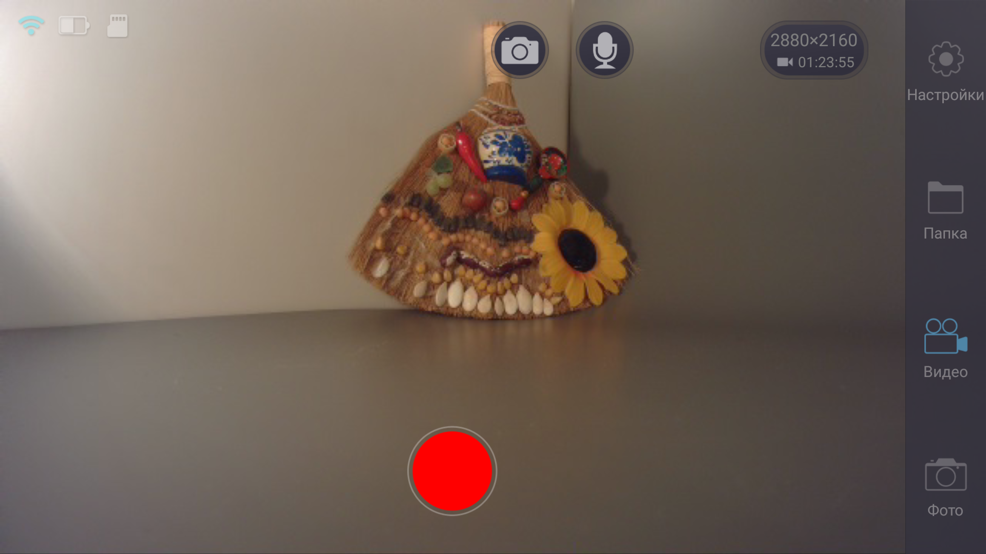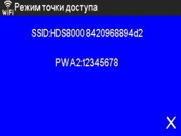 Соединение камеры с мобильным устройством осуществляется самым простым и очевидным способом. Прежде всего необходимо активировать точку доступа в камере, для этого нужно вертикальным жестом вызвать панель быстрого доступа и коснуться иконки Wi-Fi. В течение нескольких секунд камера отобразит имя созданной сети и пароль для подключения к ней.