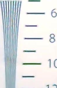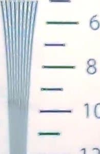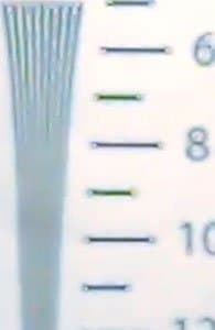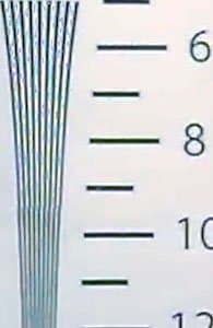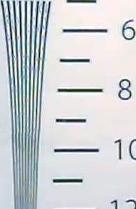 Взглянем теперь на разрешающую способность камеры в цифрах. Она измерялась путем съемки лишь одного ключевого участка тестовой таблицы, поскольку съемка таблицы целиком оказывается невозможной ввиду слишком широкого угла обзора камеры. В результате тестовых съемок были получены следующие результаты: