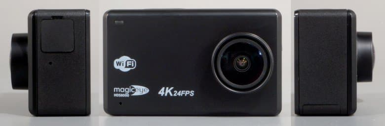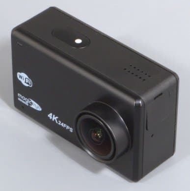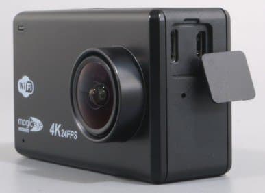 Корпус камеры изготовлен из шероховатого пластика, пропорции корпуса отличаются от пропорций большинства стандартных экшн-камер прежних выпусков: эта камера шире. Объектив камеры сдвинут от центра к краю лицевой панели. Отметим, что стекло объектива чуть выступает за края бленды — отсюда имеется риск повреждения поверхности линзы, если камеру неаккуратно положить объективом вниз на твердую царапающуюся поверхность. Для переноски камеры в комплекте имеется защитная крышка, предохраняющая объектив от царапин и ссадин, но эту крышку легко потерять.