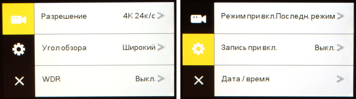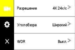| 4K (2880×2160) 24p широкий угол | 4K средний угол | 4K узкий угол | 4K стабилизатор включен |