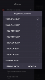 | 2880×2160 24p, 24 Мбит/с | 2560×1440 30p, 20 Мбит/с |