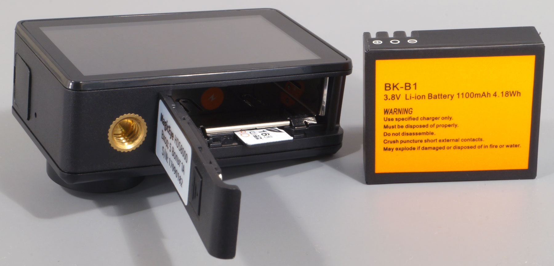 Нижняя часть корпуса содержит откидывающуюся крышку,под которой расположен слот для карты памяти формата microSD и отсек аккумулятора. Сменный аккумулятор емкостью 1050 мА·ч позволяет вести беспрерывную видеозапись в течение 93 минут в максимально возможном режиме 4K.