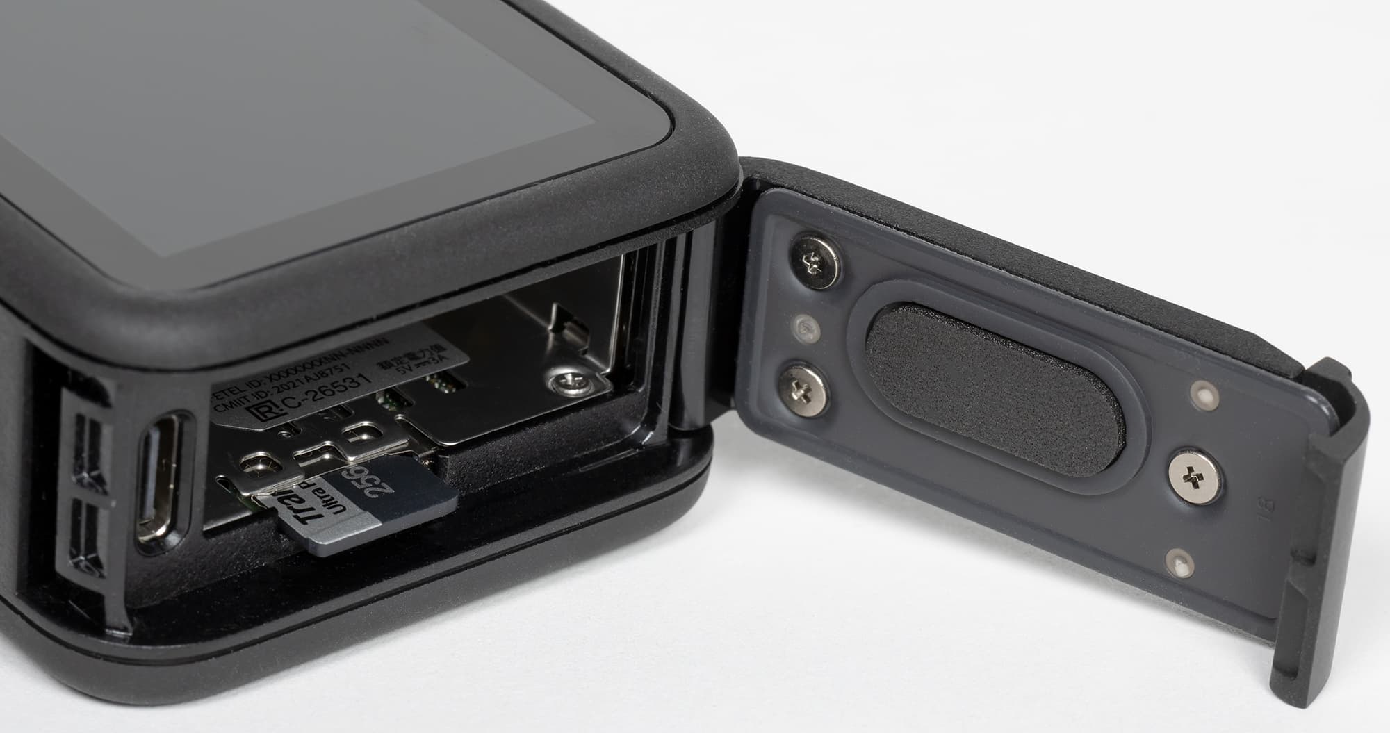 Конструкция батарейного отсека — тоже копия «девятки». В этом отсеке также расположен слот для карты памяти ит разъем USB Type-C. В зафиксированном положении крышка защищает камеру от воды на глубине до 10 метров.