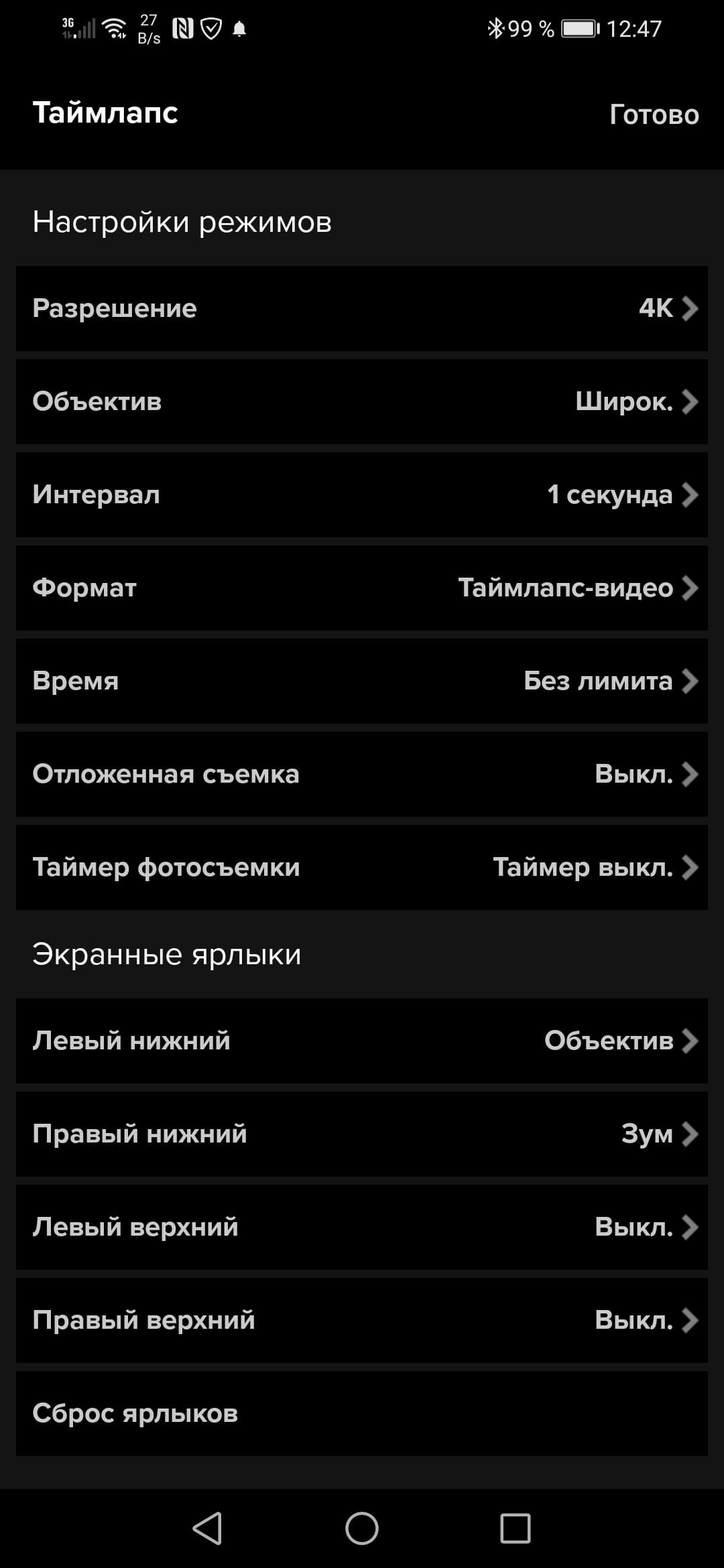 Помимо обычного таймлапса с выбором интервалов камера предлагает съемку в режиме TimeWarp. Он отличается от таймлапса тем, что в такой съемке включается стабилизатор, а скорость записи можно в любой момент изменить, нажав соответствующую кнопку на дисплее камеры, в мобильном приложении или механическую боковую кнопку. Также остался доступным режим предзаписи, когда камера постоянно фиксирует происходящее и в итоговую запись попадет все, что «видел» объектив за 15 или 30 секунд до нажатия кнопки спуска. На месте и прочие режимы: запись по расписанию, запись установленной длительности и другие.