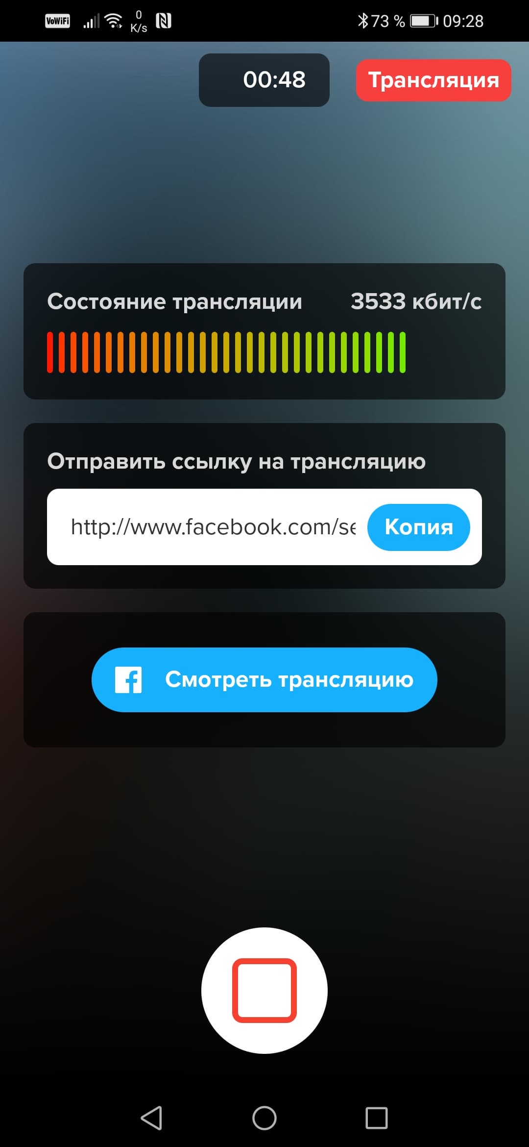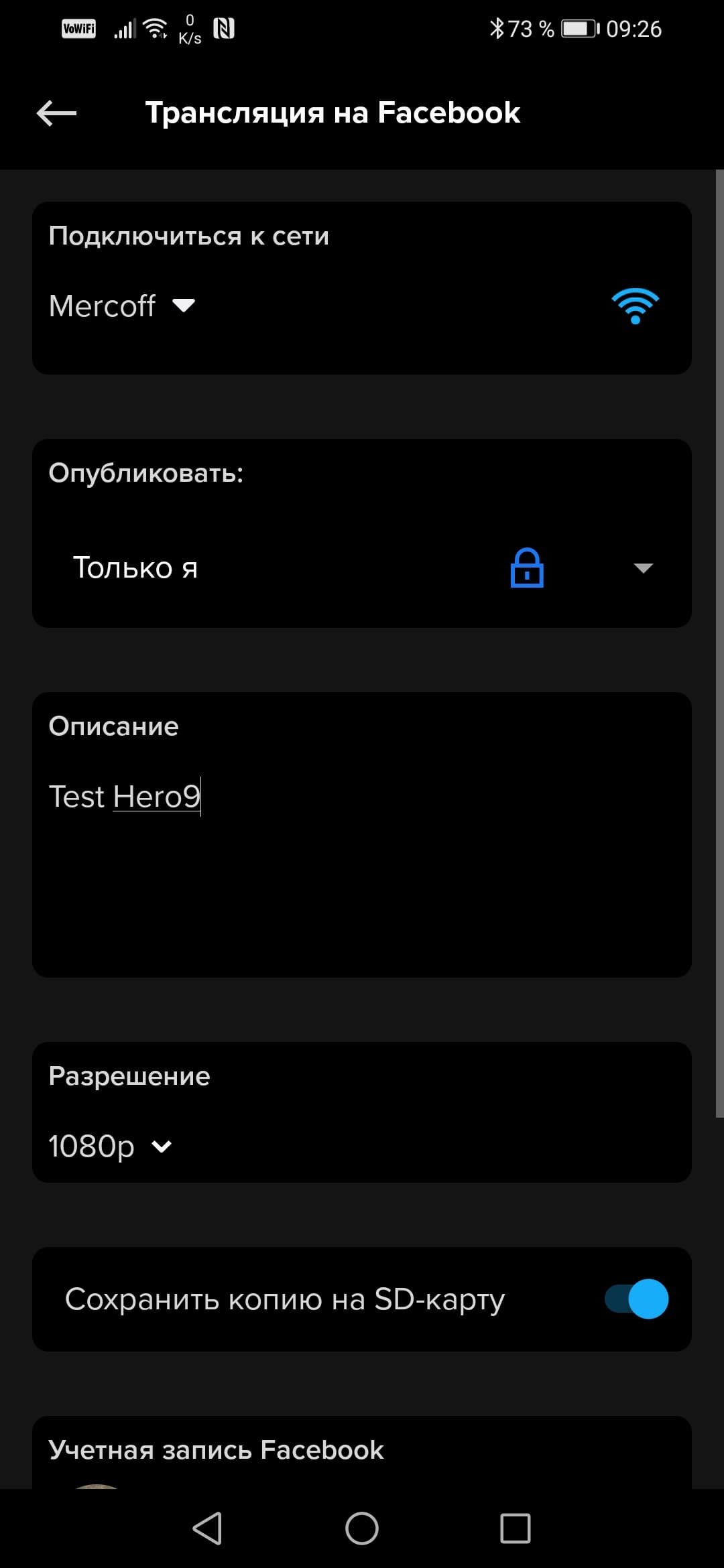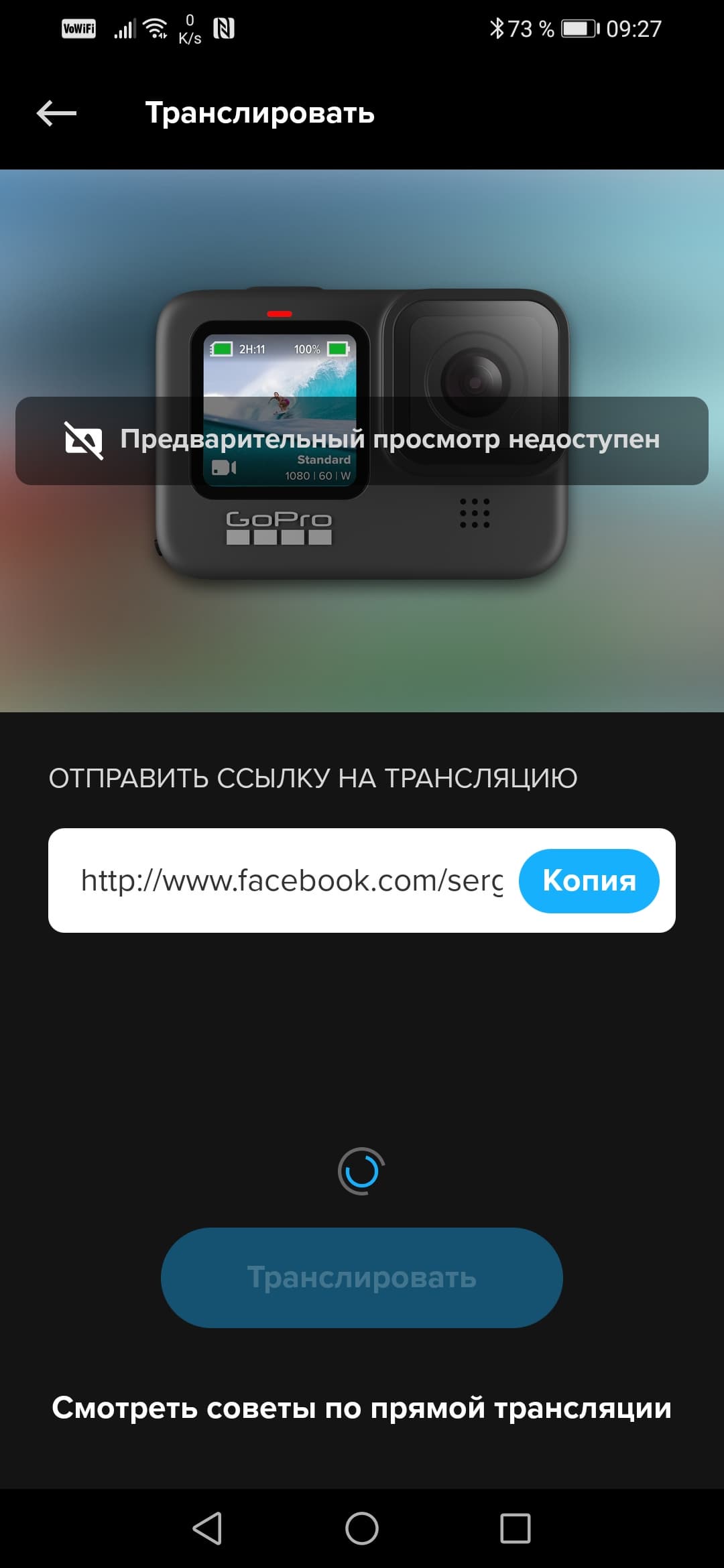 Ага, трансляция на ютуб у нас не получится — не хватает какой-то жалкой тысячи подписчиков. Что ж, попробуем провести трансляцию, к примеру, на Facebook. Сделать это оказалось очень просто и быстро. Достаточно дать разрешение GoPro на создание контента на вашей страничке, ввести параметры трансляции, выбрав круг зрителей и разрешение видео, и нажать кнопку Транслировать.