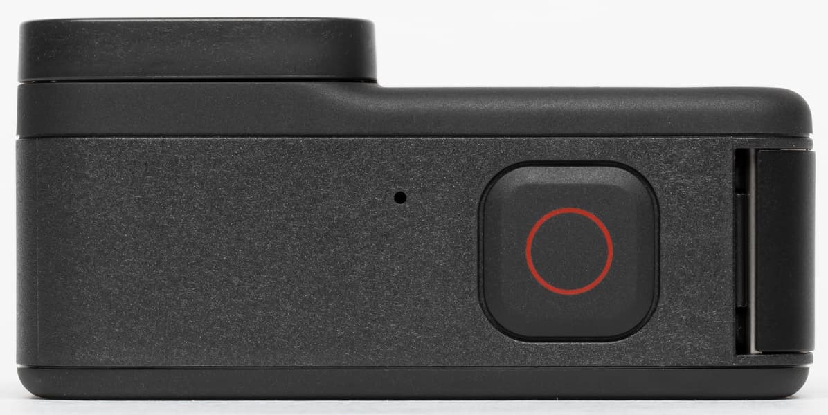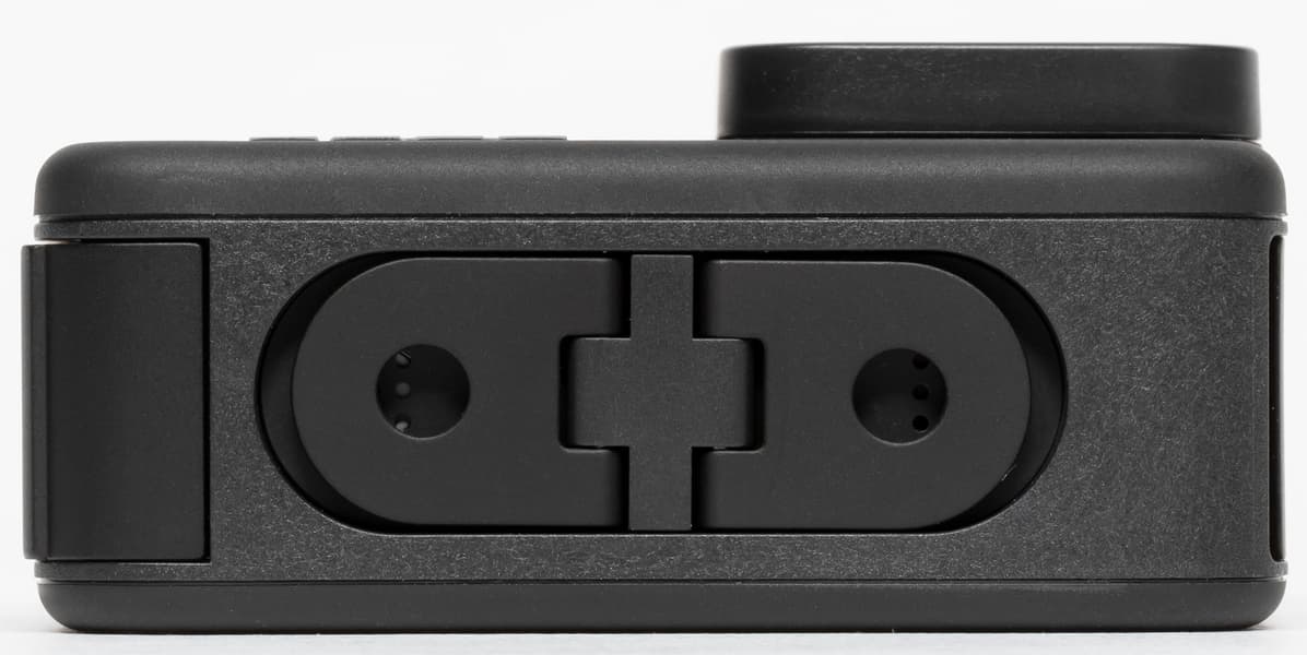 Верхняя кнопка служит для старта и остановки записи либо создания фотоснимка, это зависит от текущего режима работы камеры. Этой же кнопкой включается мгновенная запись без предварительного включения аппарата (функция QuickCaprure). Крепежная система здесь та же, что и в рассмотренной GoPro Max — два ушка, которые убираются в предусмотренное для этого углубление.