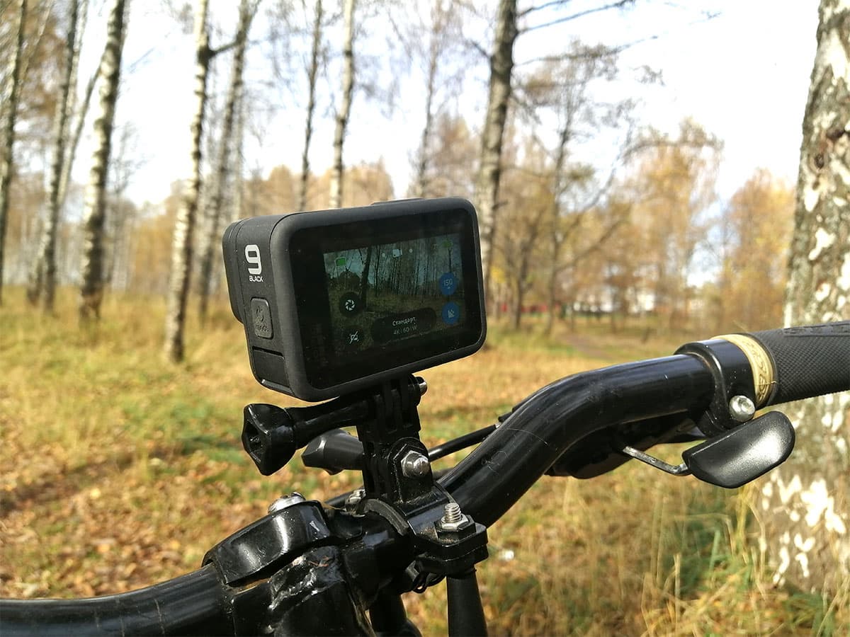 Дополнительные аксессуары приобретаются отдельно или в составе расширенных вариантов поставки. Впрочем, благодаря выкидным крепежным ушкам, которые появились еще в предыдущей восьмой версии камеры, теперь можно использовать любые крепления, стоимость некоторых — сто рублей за пучок. В базарный день. Так, чтобы прикрепить камеру к штативной площадке, мы применили копеечный переходник с винтовым штативным отверстием, а к рулю велосипеда прикрепили таким же стандартным кронштейном с ободком и «ушками», который остался от какой-то древней экшн-камеры.