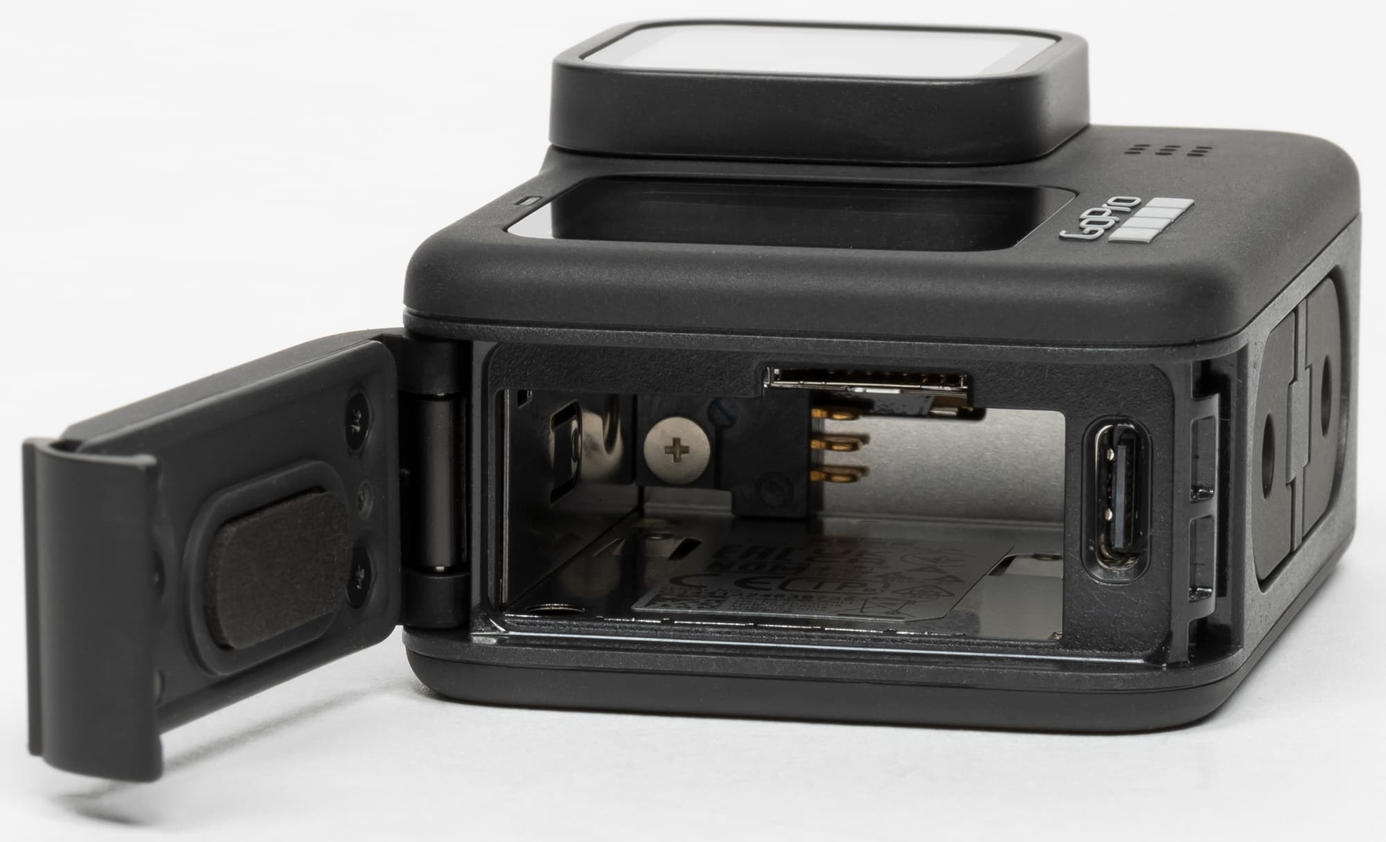 Под крышкой, которая занимает всю правую сторону корпуса, находится батарейный отсек, слот для карты памяти и разъем USB Type-C. В зафиксированном положении крышка защищает камеру от пыли и воды на глубине до 10 метров.