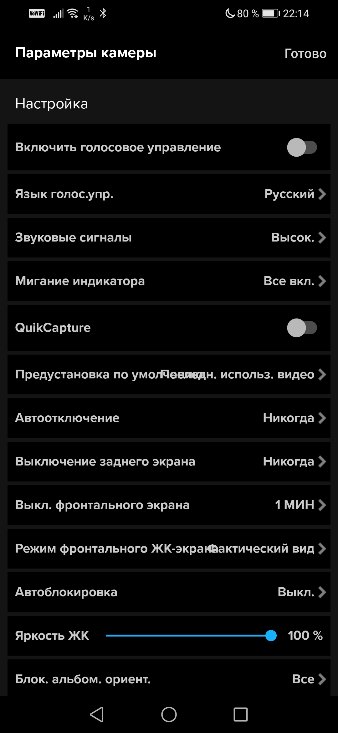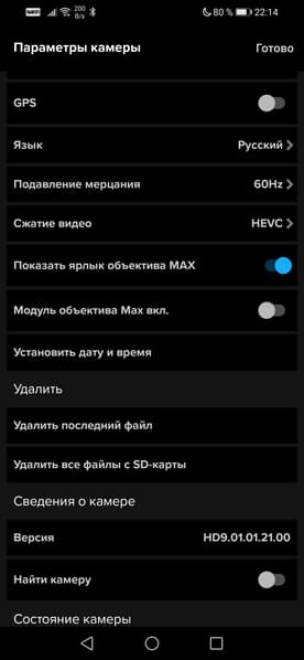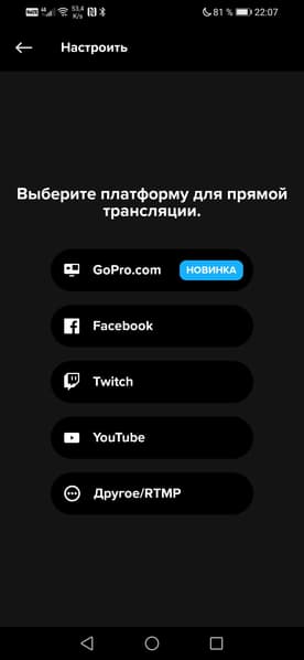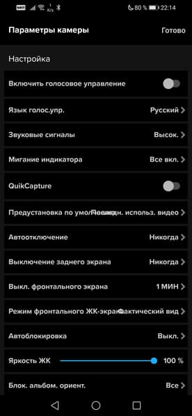 Настройки камеры занимают две страницы экрана, некоторые настройки скрыты в подпунктах. Такие, как выбор разрешения или режима стабилизатора. Также в приложении имеется любопытная возможность прямой трансляции на несколько сервисов и даже на пользовательский сервер.