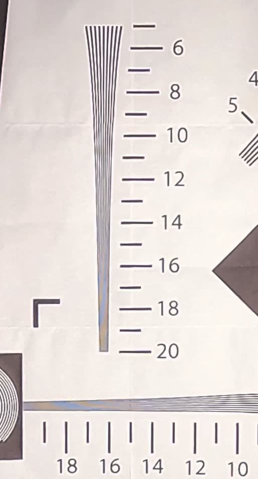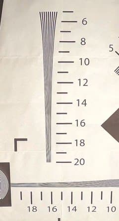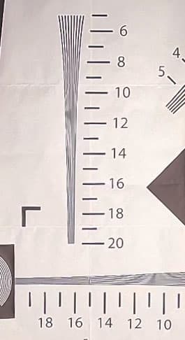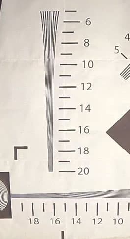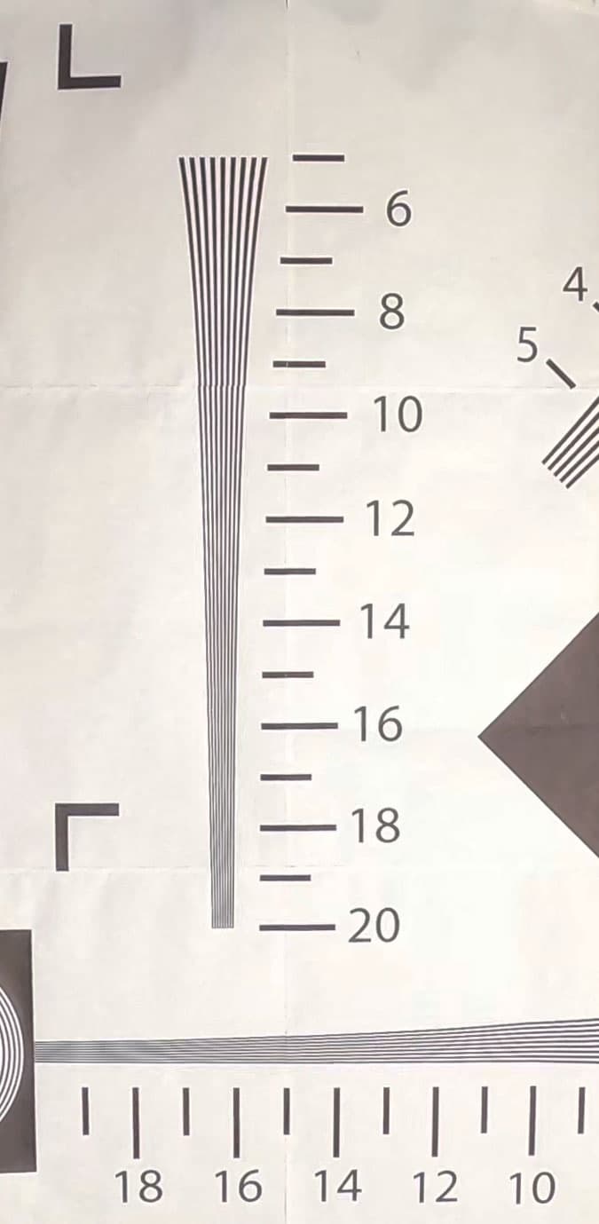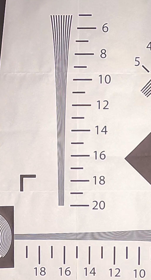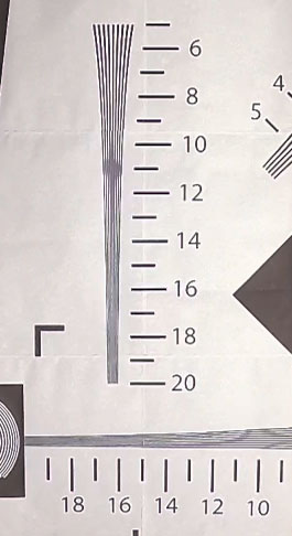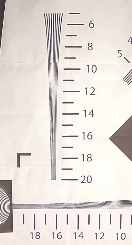 Съемки тестовой таблицы показывают ожидаемую зависимость разрешающей способности камеры от выбранного угла обзора. Чем меньше угол — тем ниже разрешающая способность, что естественно при обрезке кадра. В 5K-режиме с широким углом обзора камера дает более 2000 ТВ-линий по горизонтальной стороне кадра. 2000 — это максимум, который можно получить с помощью нашей таблицы. Да, пора заводить новую.
