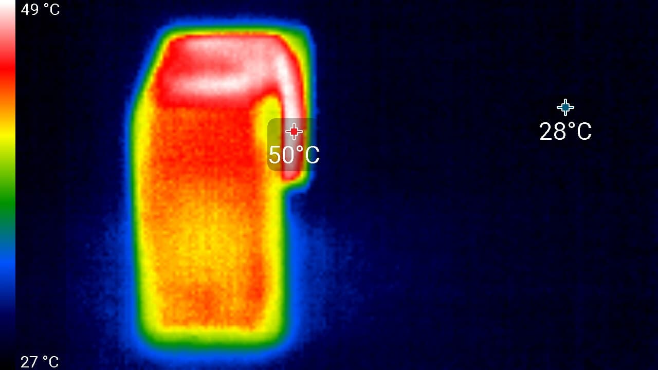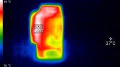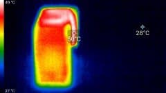 Сразу же после аварийного выключения камера подверглась фотографированию тепловизором. Опыты проводились в помещении с температурой около 27 °C (все-таки центральное отопление теплой осенью — это зло).