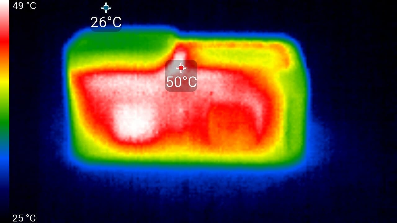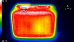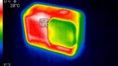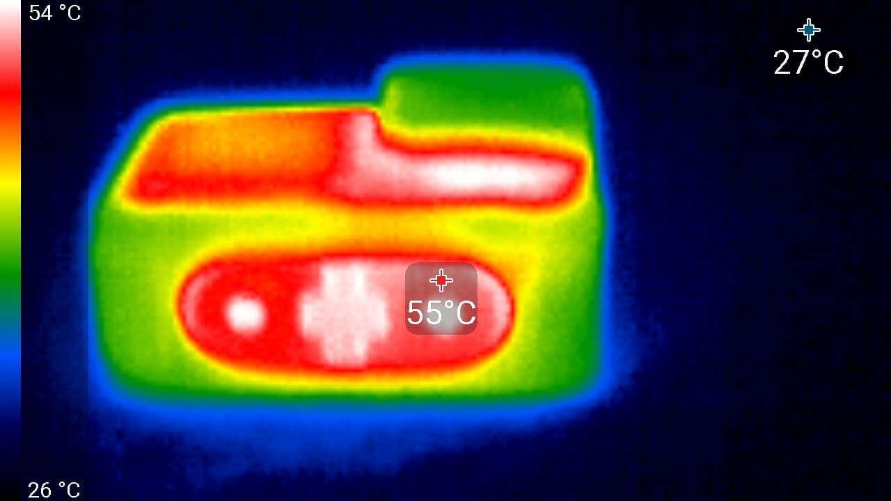 Предыдущая модель нагревалась почти так же. Ну, может, на один-два градуса сильнее. Здесь максимальная температура некоторых участков корпуса составила 58 °C. Что, в принципе, объяснимо: пусть объем аппарата и увеличился, но ведь и сенсор стал вдвое мегапиксельнее.