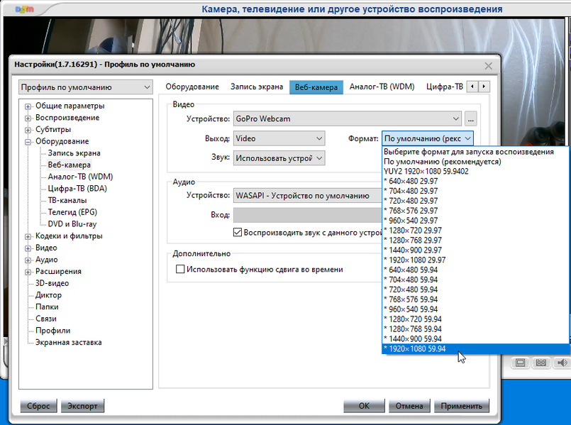 USB-порт теперь может использоваться для использования аппарата в роли веб-камеры. Для того чтобы компьютер распознал камеру, требуется установить фирменное программное обеспечение Windows GoPro Webcam. Теперь становится возможно получать видеосигнал непосредственно на ПК, но поддержку этой камеры имеют не все программы. например Viber отказывается распознавать камеру, в списке медиаустройств ее просто нет. Зато PotPlayer прекрасно отображает как камеру, так и ее видеосигнал. Причем с разрешением Full HD.