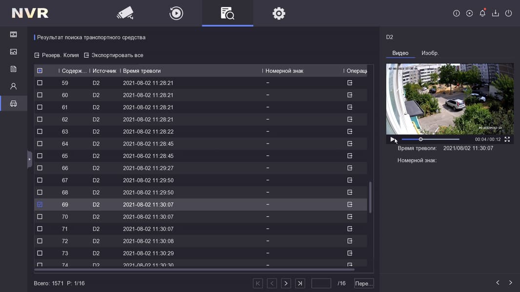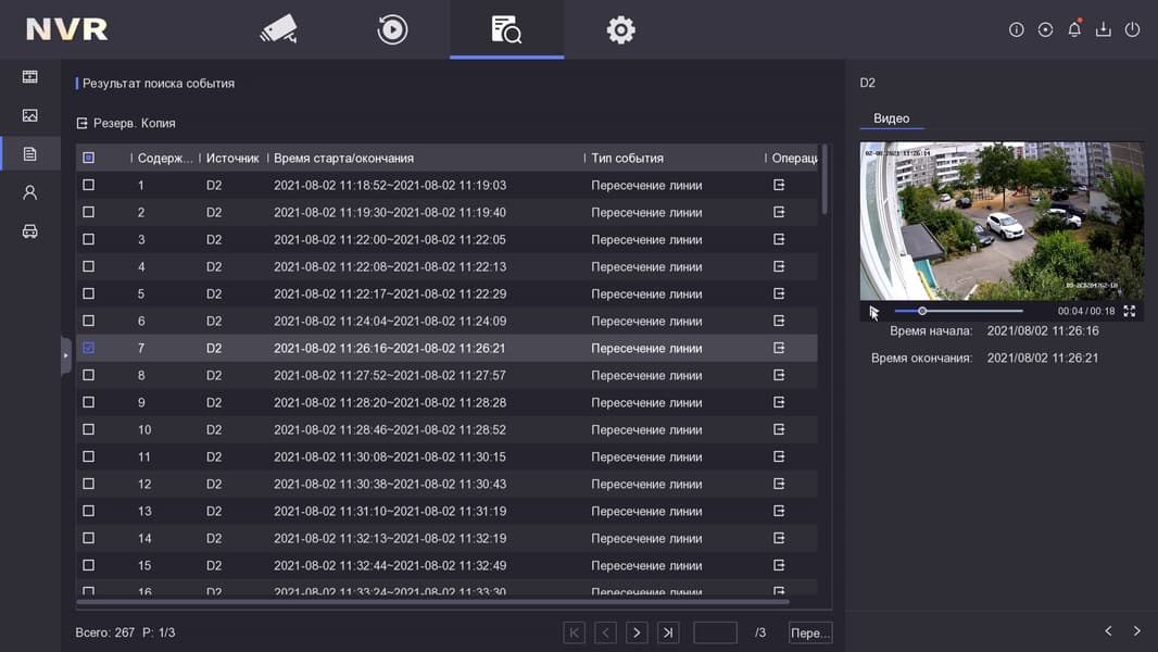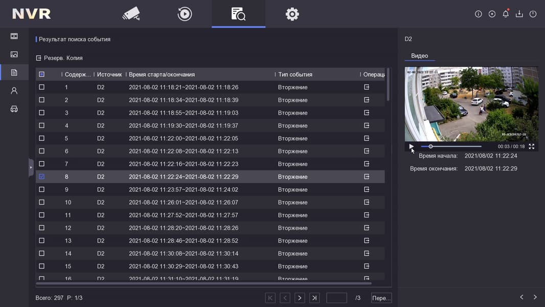Так, если мы выберем событие Вторжение или Пересечение линии, выберем камеру и уточним временные рамки, то регистратор за доли секунды отыщет и выведет на экран огромный список роликов, записанных по этому событию. В миниатюрном окошке отображается стоп-кадр и видео выбранного отрезка, здесь же можно скачать выбранные ролики либо зарезервировать их для будущего скачивания.