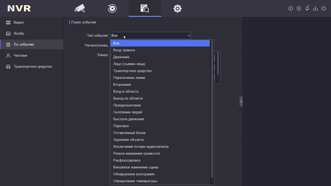 Но вернемся в «родной» интерфейс регистратора и начнем удивляться. Помимо банального поиска по дате/времени, здесь доступен поиск невероятного количества типов событий. Разумеется, большинство из них не поддерживается нашими камерами. Ведь, как мы уже говорили, камер и регистраторов много, а софт — один. Тем не менее, отыскать поддерживаемый тип событий нетрудно.