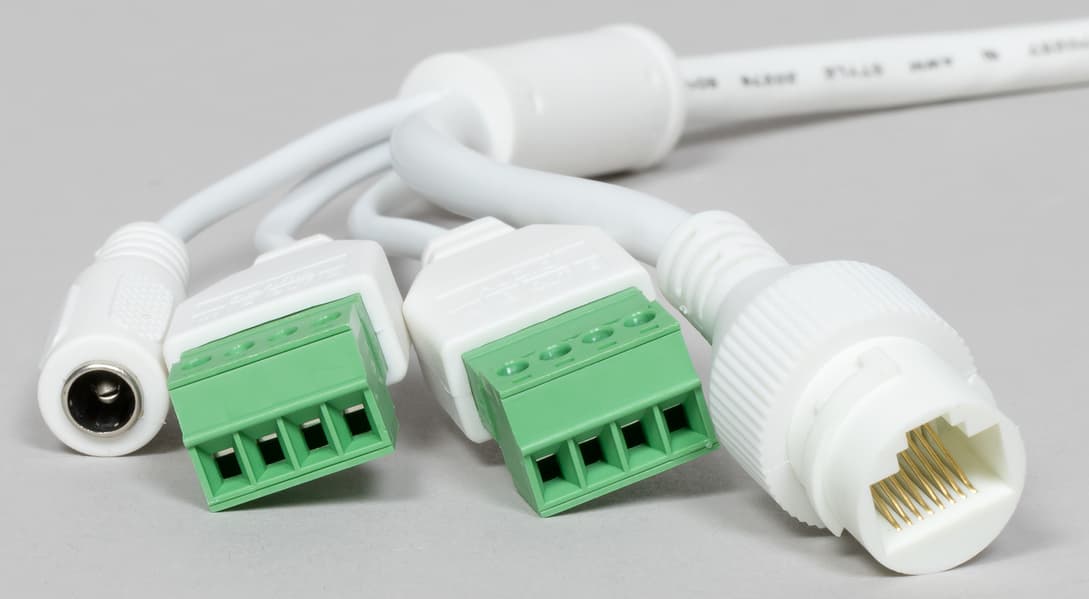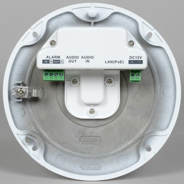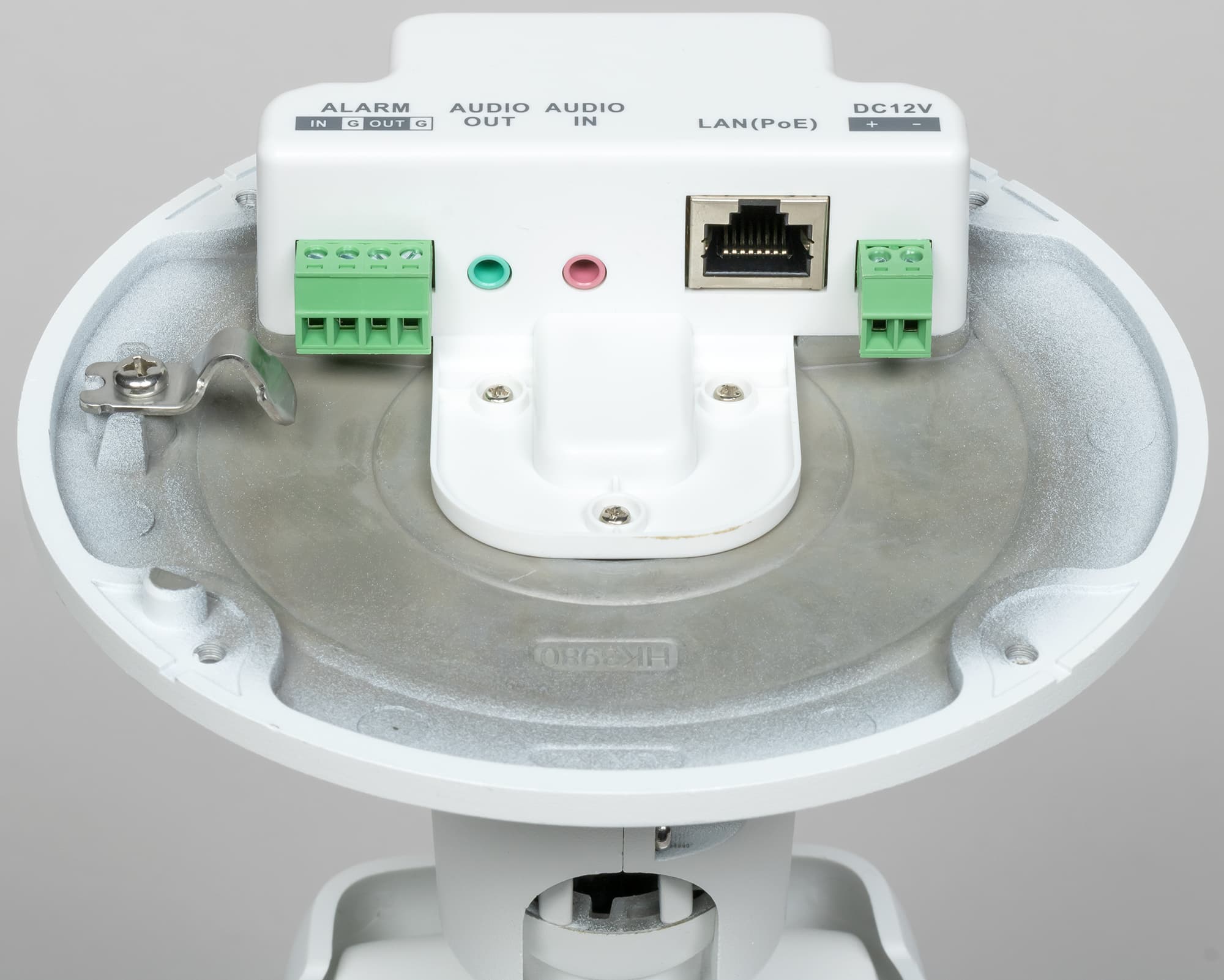 Как и bullet-камера, этот аппарат имеет похожий «хвостик» с разъемами на конце. Но разъемов здесь вдвое больше. Не только питание и LAN с функцией PoE, но также колодка для подключения внешнего тревожного датчика и еще одна колодка для подключения внешнего микрофона и динамика.