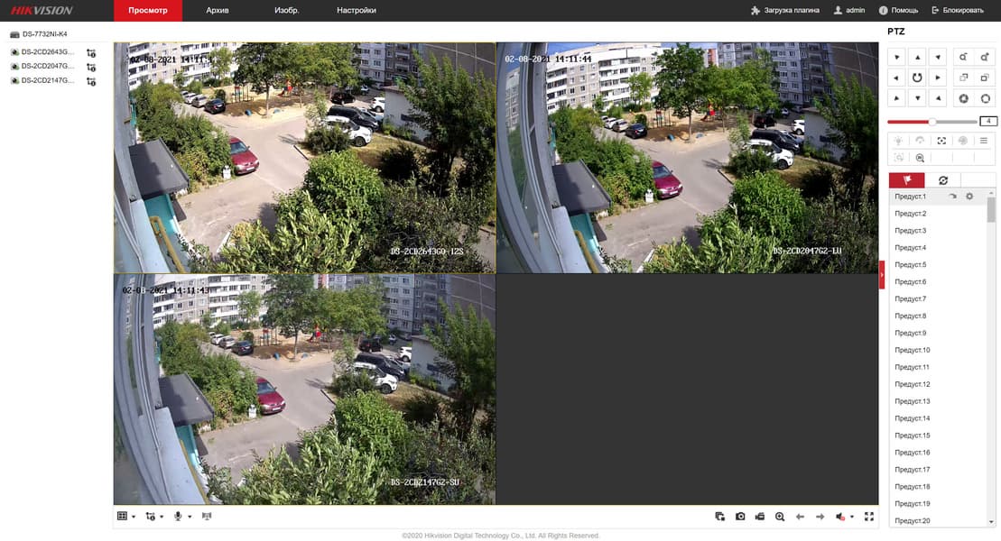 ПО камер разбито на вкладки-страницы, где главная вкладка — Просмотр. Здесь, помимо окна трансляции, присутствует несколько инструментов для вызова быстрых функций. Не все они работоспособны (в данном случае не функционирует PTZ), ведь конструкция камер разная, а софт, по сути, один. Переписывать интерфейсы под каждую модель не имеет смысла, эта распространенная практика применяется всеми без исключения производителями аналогичных гаджетов.