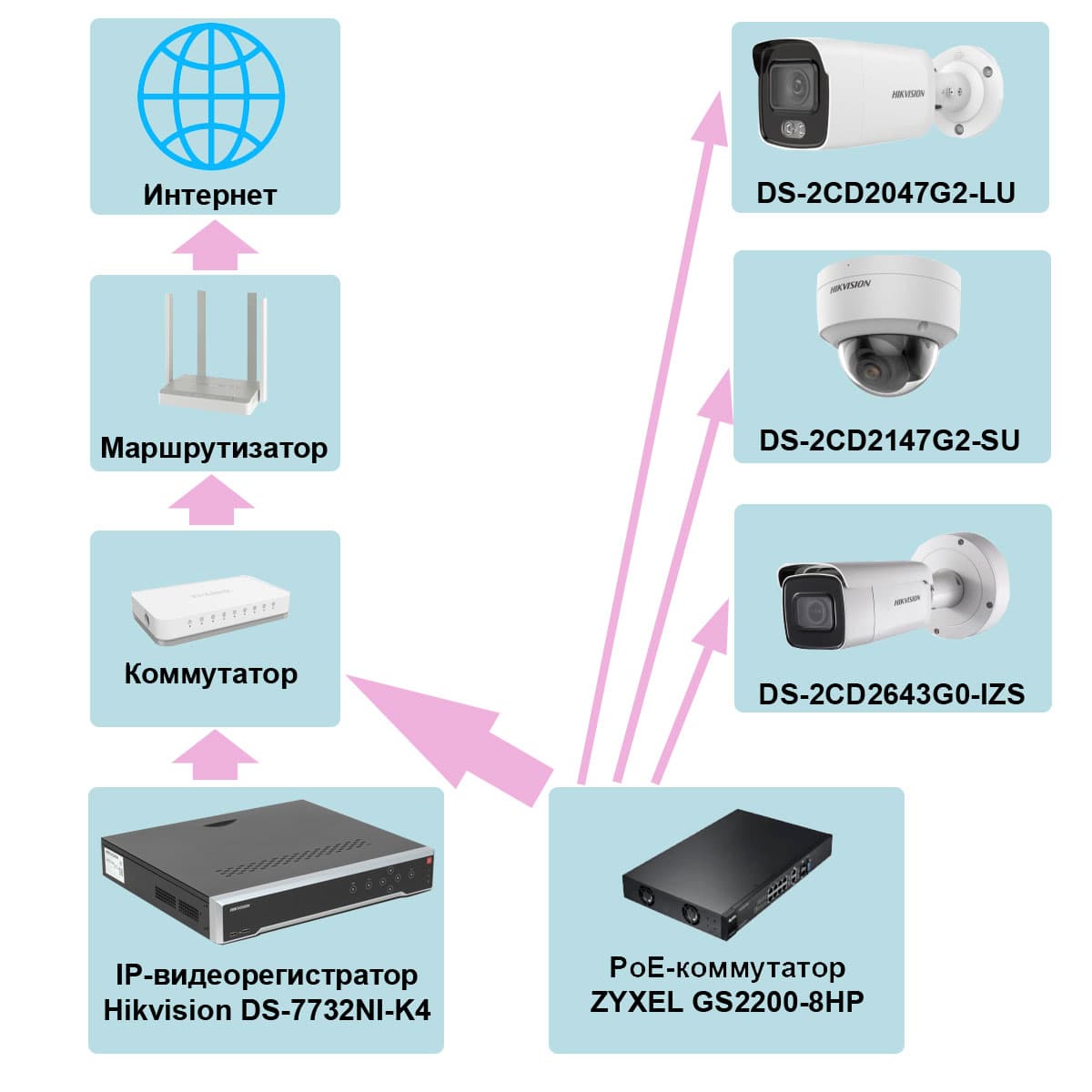 Он оснащен LAN-портами с технологией PoE, следовательно, к каждой камере достаточно подвести один LAN-кабель. Этот коммутатор соединен с другим коммутатором (обычным домашним), который составляет основу локальной сети. Также к домашнему коммутатору подключен наш регистратор, который станет записывать поток со всех трех камер. Таким образом, вся система будет доступна как в локальной сети, так и «снаружи», через интернет.