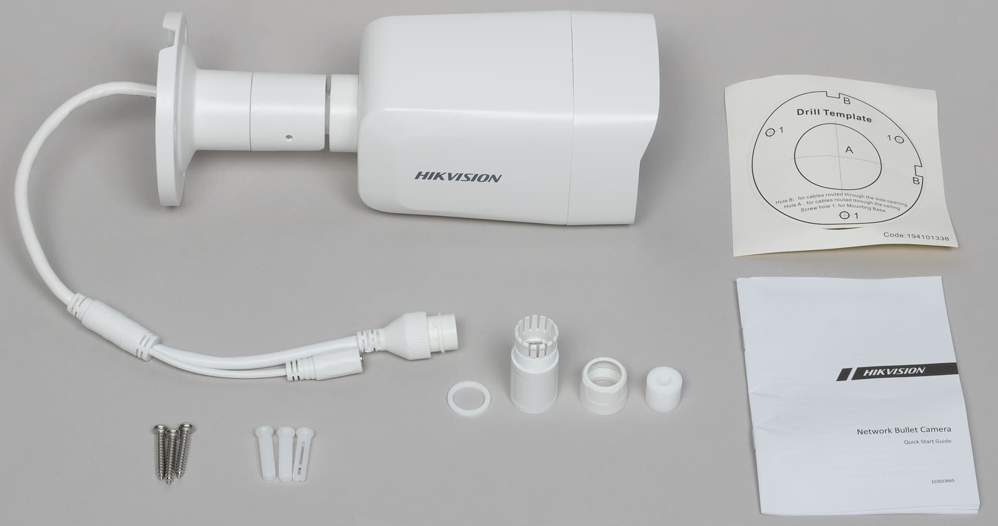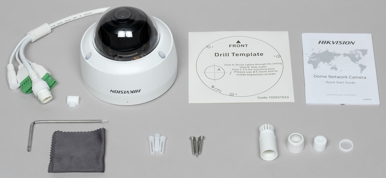 Скромная комплектность включает в себя камеру, набор шурупов с дюбелями и трафаретом для просверливания крепежных отверстий, герметизирующую муфту для подключения LAN-кабеля и краткое руководство пользователя.