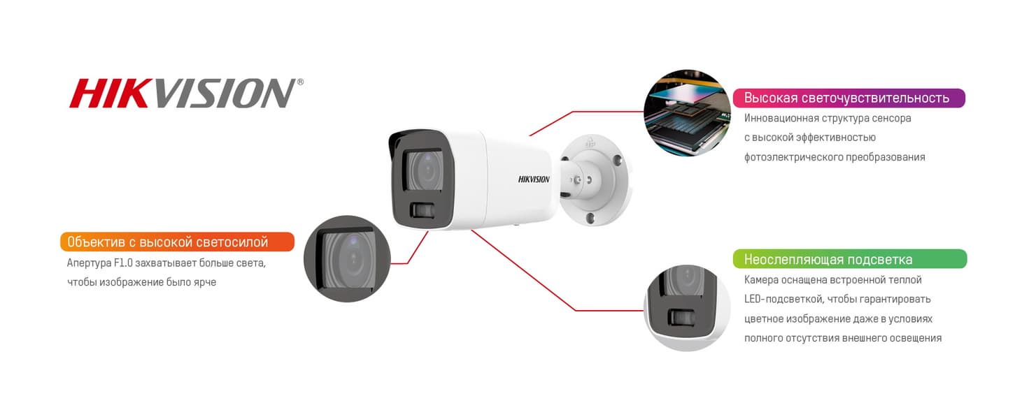Слоган ColorVu можно перевести буквально как «цветной вид». Или ви́дение, с ударением на первый слог, разумеется. Однако цифровой цветной видеосъемке много десятков лет, что тут нового? А как насчет цветной съемки, но ночью? Эта возможность достигается двумя основными факторами: светосильная оптическая система с большой апертурой + высокочувствительный сенсор, а в некоторых моделях камер еще и третьим дополнительным обстоятельством, теплой подсветкой. Поодиночке эти технологии особо ничем не примечательны, они давно известны и являются курсовым маяком для разработчиков видеотехники. Чарующая сила заключается именно в симбиозе этих технологий.
