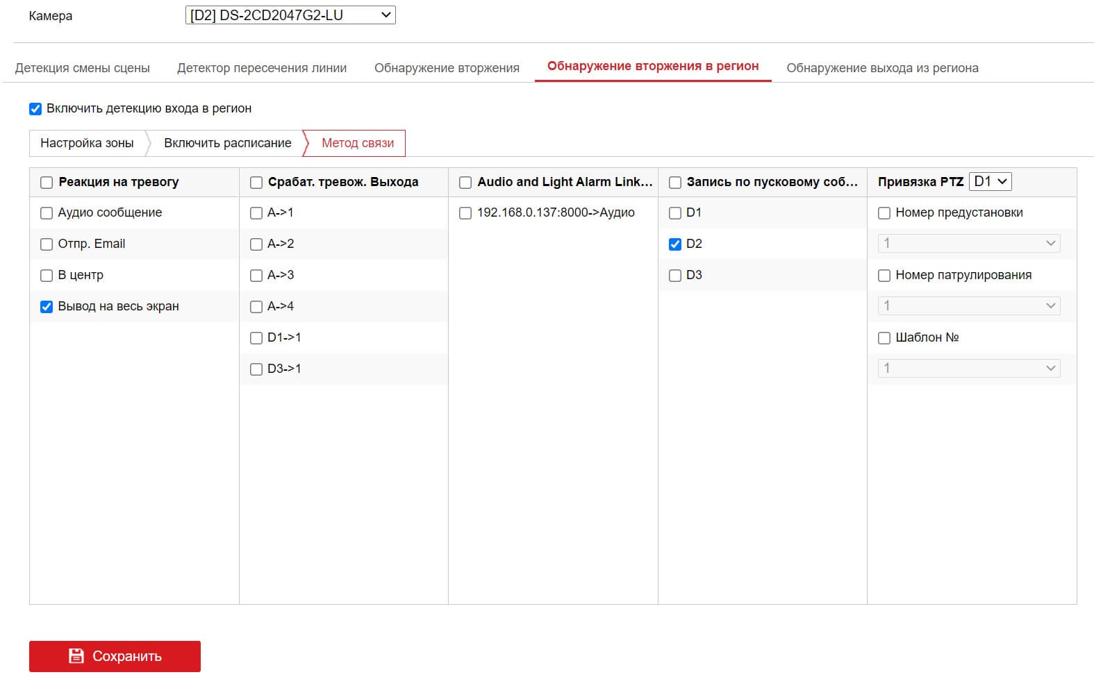 В зависимости от настроек отображения потоков регистратор может тем или иным образом обращать внимание оператора на какие-либо события. Например, в ответ на Smart-событие Обнаружение вторжения в регион регистратор может отправить сигнал на внешние устройства, воспроизвести пользовательское аудиосообщение, отправить на E-Mail тревожный снимок, переместить картинку с камеры в центр экрана или развернуть изображение на весь экран.
