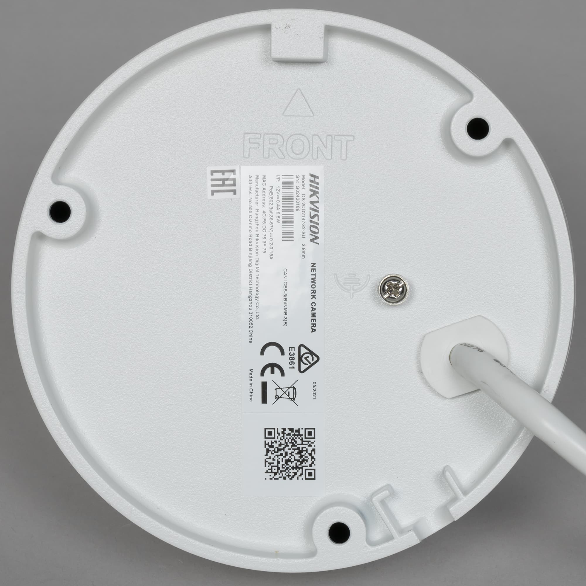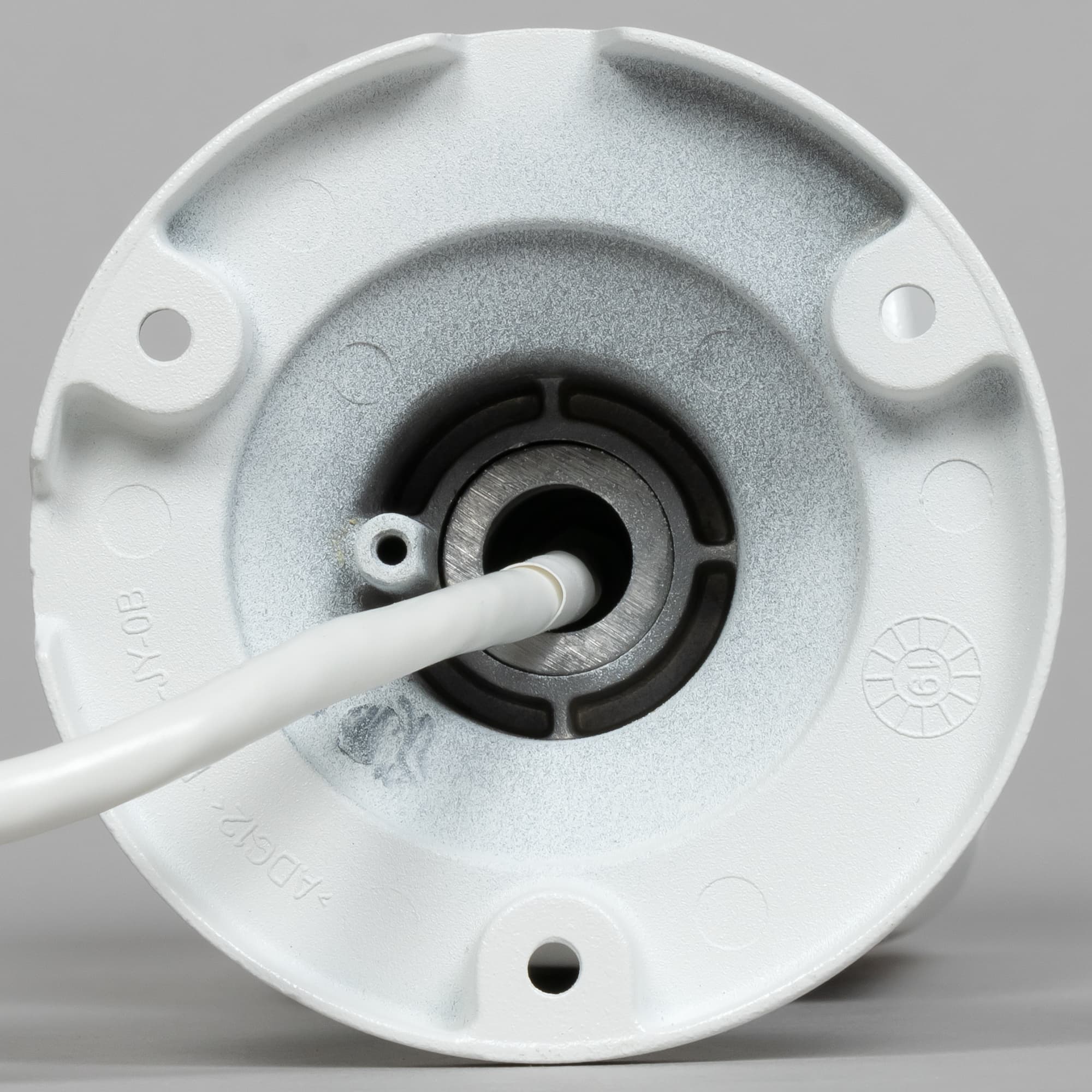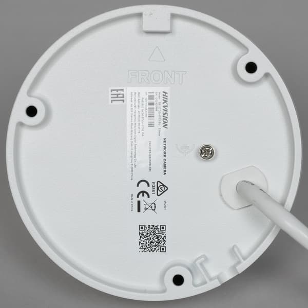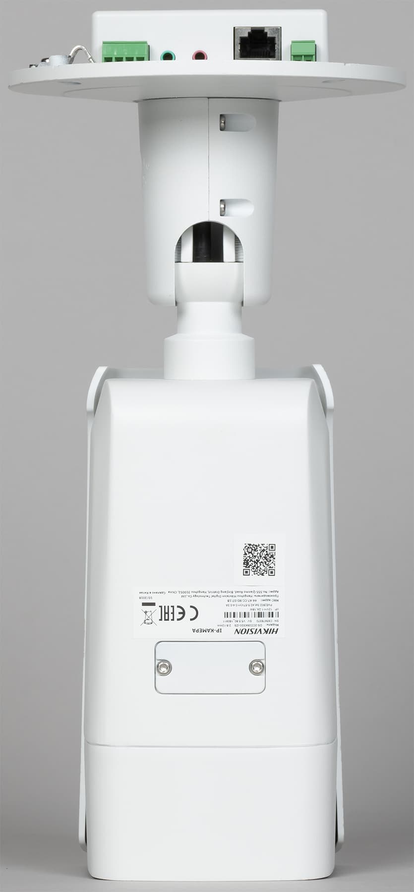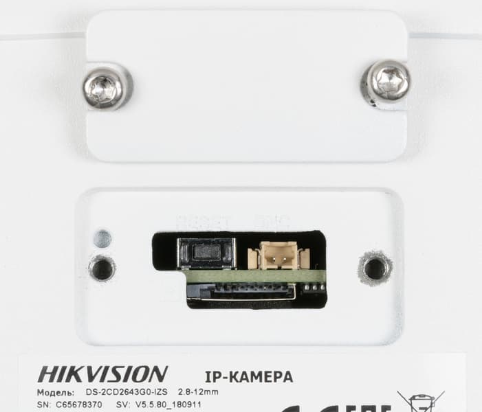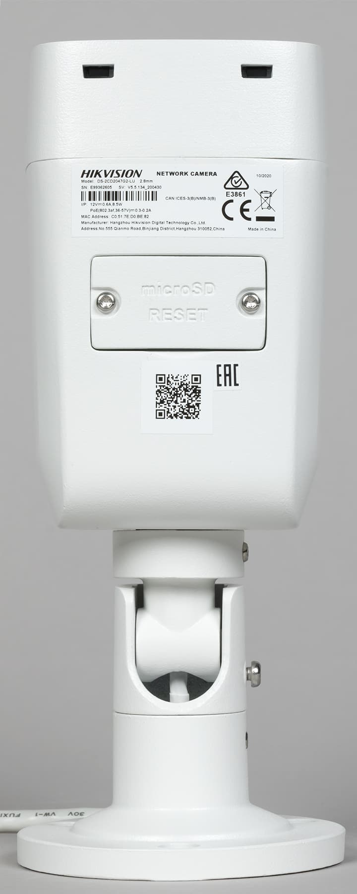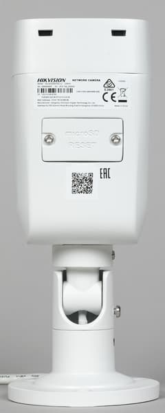 Из основания подставки выходит короткий «хвост», содержащий два разъема: питания и LAN с функцией PoE. Герметичный корпус камеры не допускает проникновения внутрь осадков и пыли. В нижней части корпуса имеется герметичный люк, привинчиваемый болтами.
