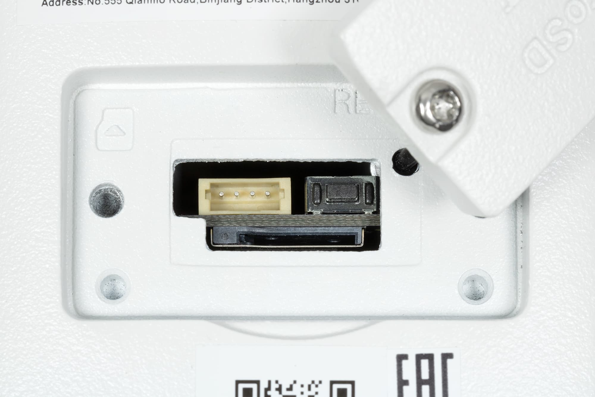 Под крышкой находится слот для карты памяти, кнопка сброса и четырехконтактный разъем для подключения внешних тревожных датчиков.
