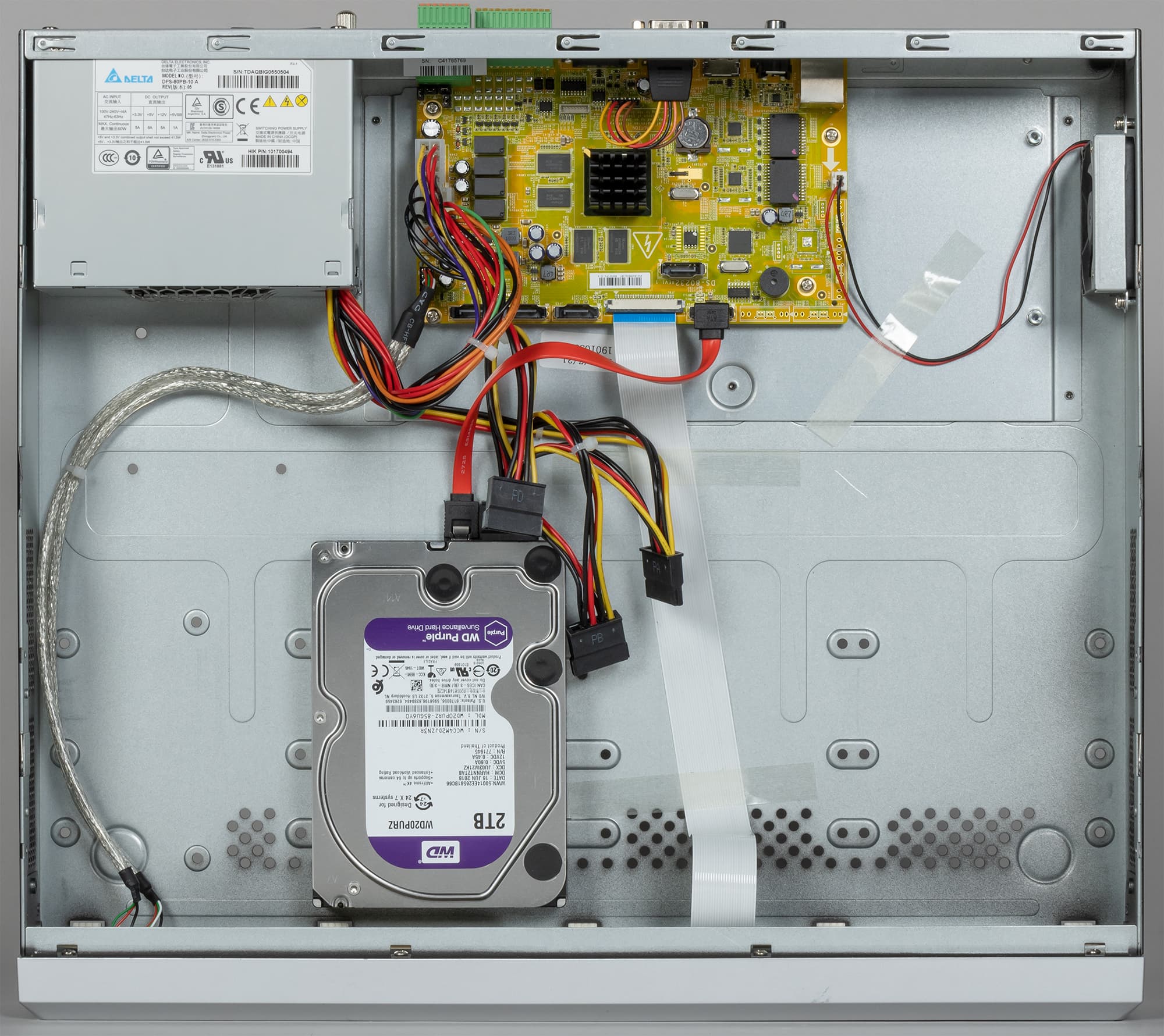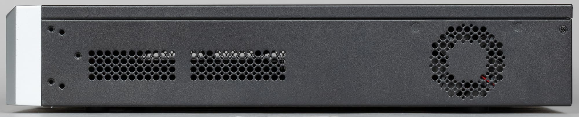 Ввиду того, что регистратор рассчитан на установку аж четырех «полноразмерных» жестких дисков, ему явно требуется хорошее охлаждение. И оно здесь имеется. Вентиляционные отверстия по периметру корпуса плюс боковой вентилятор, принудительно выгоняющий нагретый воздух из корпуса.