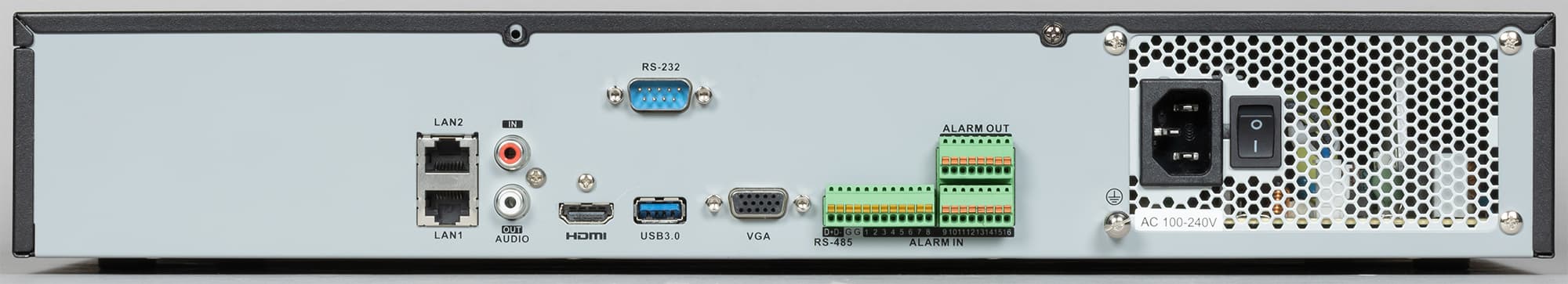 Большого количества интерфейсов теперь не требуется, ведь подключаемые камеры передают поток по сети. Для одновременной работы 32 камер вполне хватило бы одного гигабитного LAN-порта. Однако производитель подстраховался и добавил второй LAN, для обеспечения мультиадресного и отказоустойчивого режимов работы. Два независимых видеовыхода — цифровой HDMI и аналоговый VGA — позволяют подключить два монитора, линейные аудиоразъемы поддерживают подключение микрофона и акустических систем с усилителем, а скоростной USB-порт даст возможность без задержек скопировать с дисков архивный материал. Не забыты и тревожные входы-выходы, позволяющие получать информацию с внешних датчиков, а также отправлять сигнал на внешние устройства (шлагбаумы и другие средства контроля доступа).