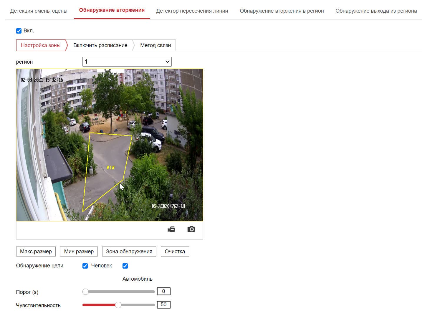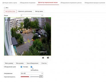 В следующем видеоролике показано, как это работает. Обратите внимание, регистратор не среагировал на парочку людей, которые пересекли запрограммированную линию. Это потому, что в настройках Smart-события Детектор пересечения линии не активирована никакая функция реакции. Однако при обнаружении вторжения в регион регистратор среагировал должным образом — ненадолго переключил видео с камеры в полноэкранный режим.