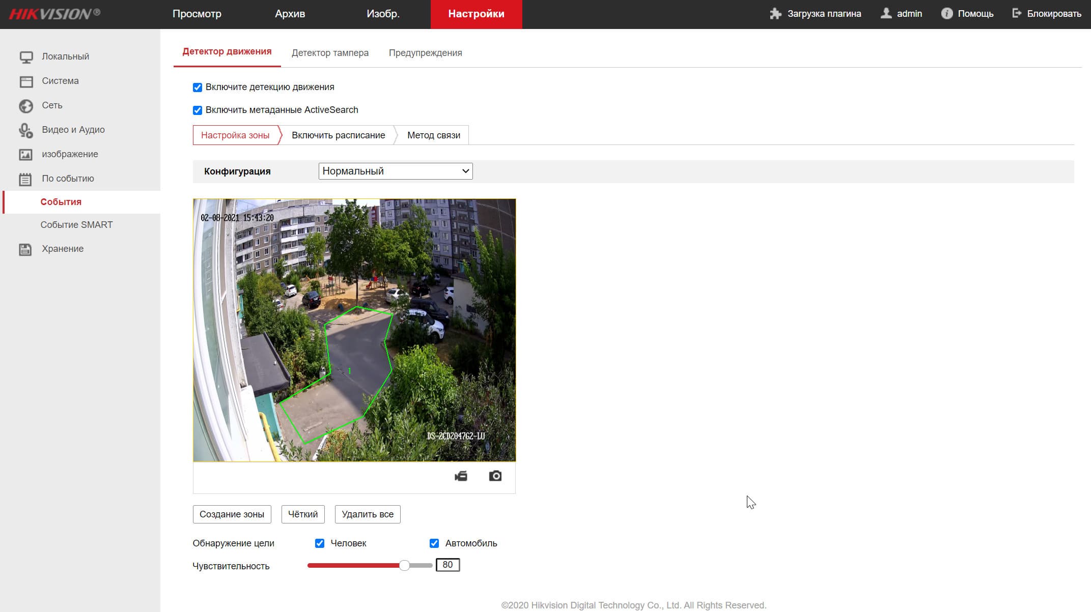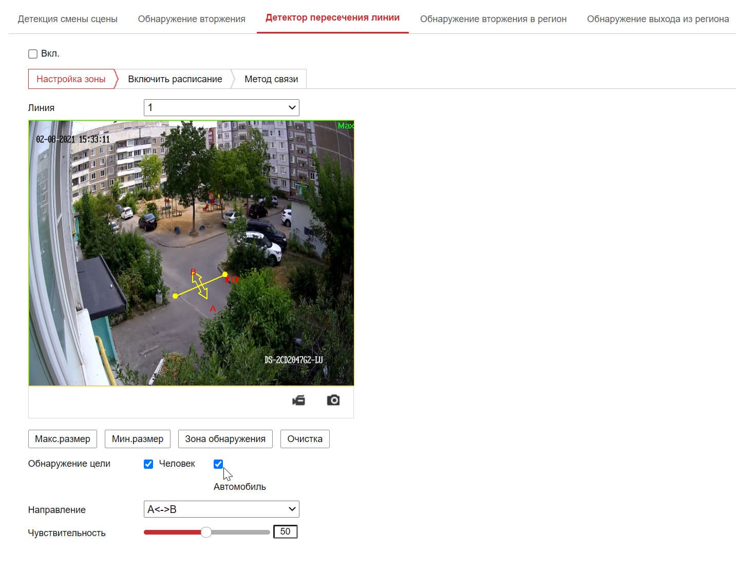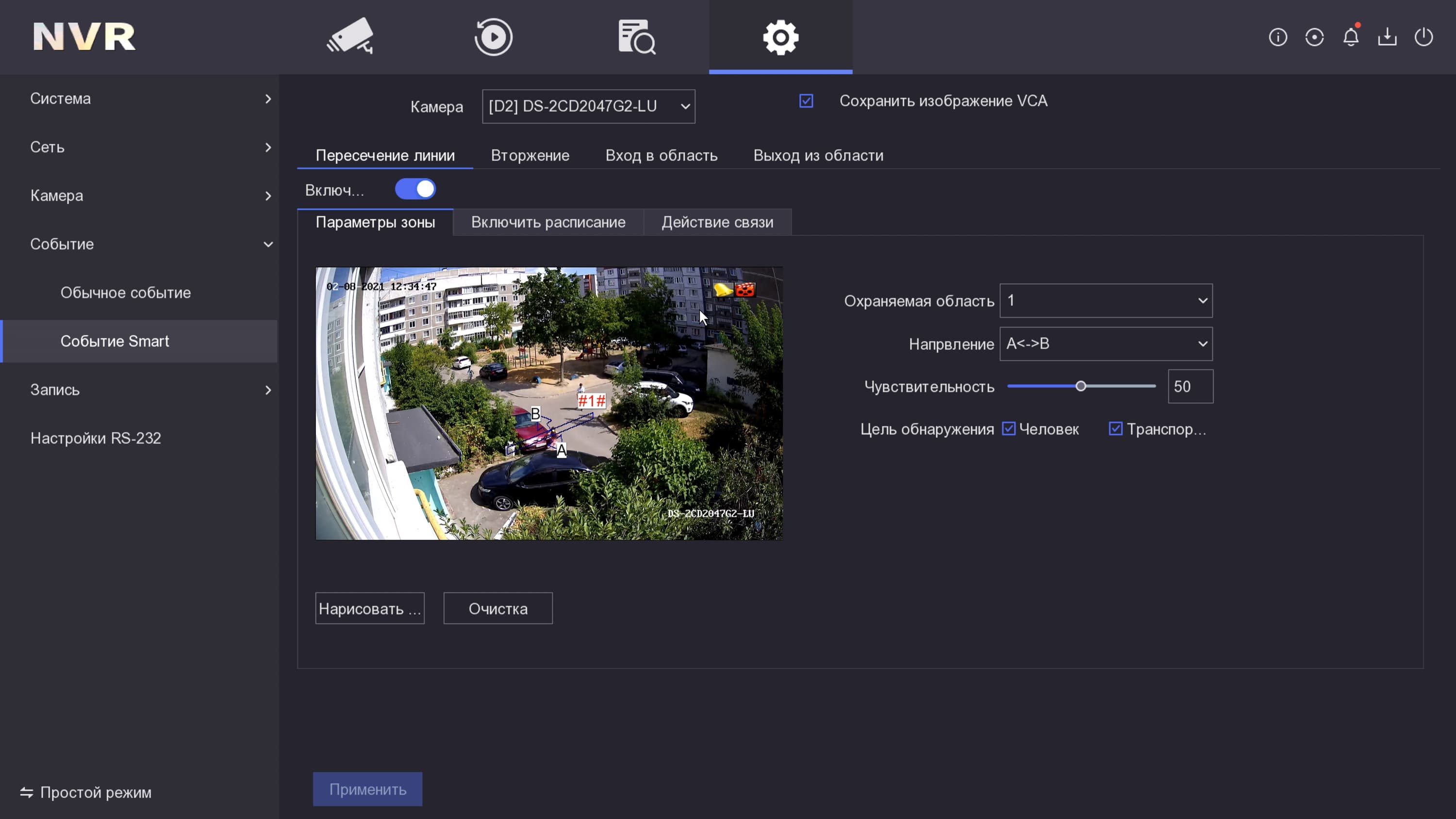 На главной странице разрешается изменить тип отображаемого потока, сделать скриншот или принудительно включить запись в локальную папку ПК, изменить параметры видеопотока, характер картинки и отображаемые поверх нее OSD элементы. Также в микровкладке VCA есть возможность активировать функцию Анализ видеоконтента (VCA): Событие Smart либо Снимок лица. В нашем случае снимок лица использовать проблематично, ведь камеры расположены слишком далеко от потока людей, поэтому настроим реакцию камеры на события Smart.