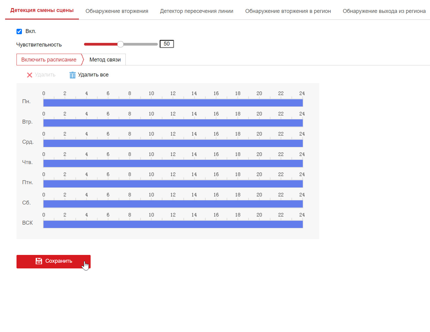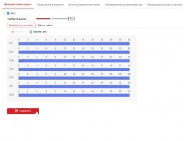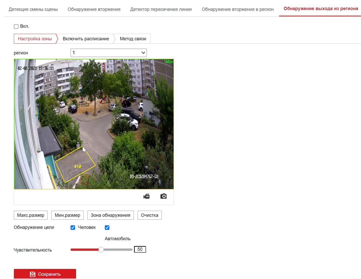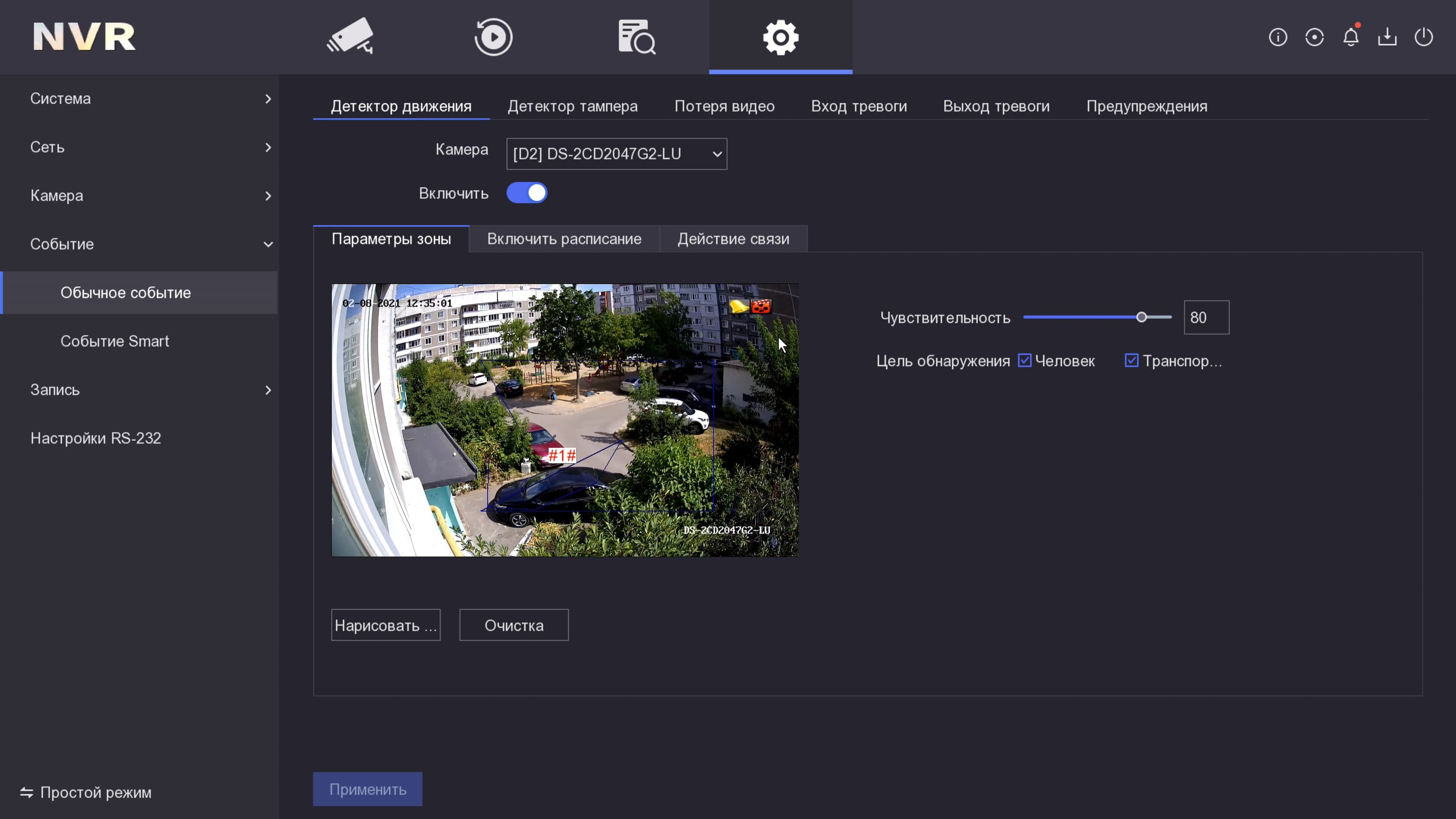 На главной странице разрешается изменить тип отображаемого потока, сделать скриншот или принудительно включить запись в локальную папку ПК, изменить параметры видеопотока, характер картинки и отображаемые поверх нее OSD элементы. Также в микровкладке VCA есть возможность активировать функцию Анализ видеоконтента (VCA): Событие Smart либо Снимок лица. В нашем случае снимок лица использовать проблематично, ведь камеры расположены слишком далеко от потока людей, поэтому настроим реакцию камеры на события Smart.