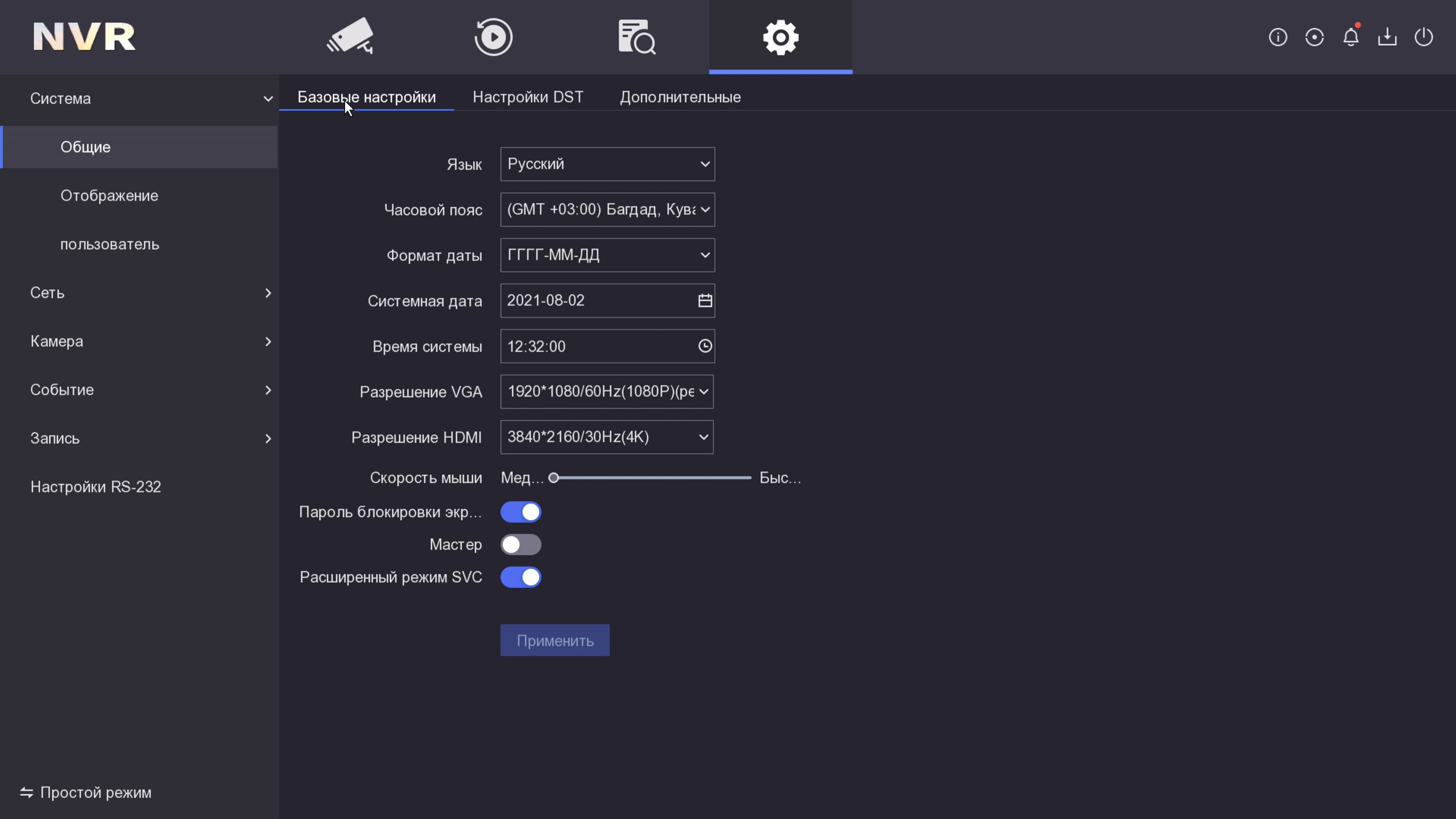 В отличие от настроек камер, настройки регистратора доступны не только из локальной сети, но и в «натуральном» виде, с прямым входом оператора в интерфейс прибора. Как мы уже говорили, два независимых видеовыхода позволяют подключить к регистратору одновременно два монитора, при этом один из мониторов может иметь разрешение 4K. Воспользуемся этим видеовыходом, чтобы изучить интерфейс и функции аппарата как можно детальнее. Детальнее во всех смыслах.