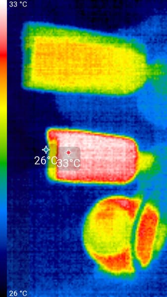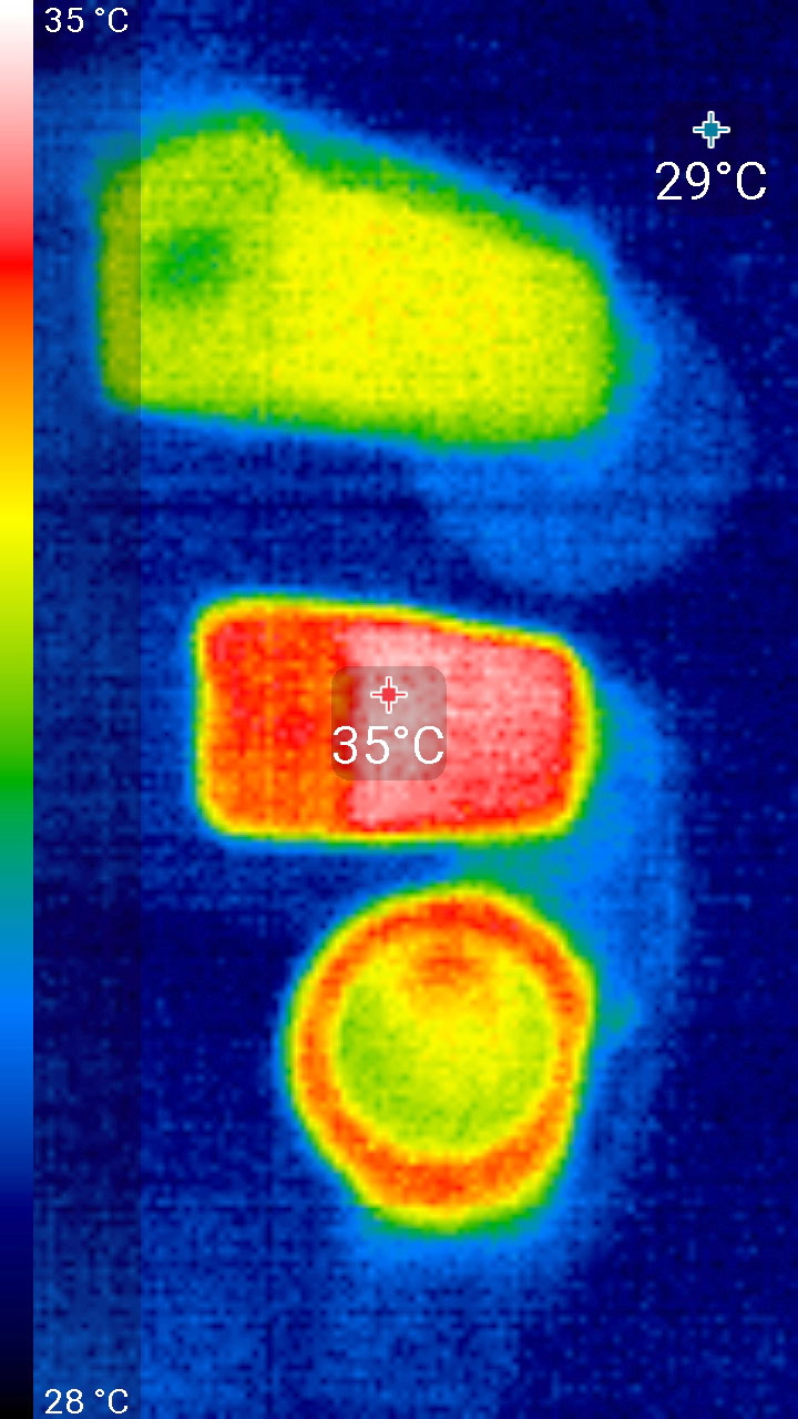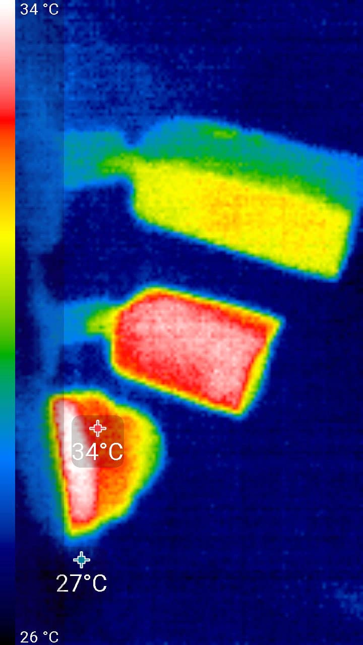 Наконец, о нагреве устройств. Начнем с камер. Во время длительной работы три наши камеры нагреваются совсем незначительно. Следующие снимки произведены тепловизором после нескольких часов работы камер в помещении с температурой 26-27 °C.