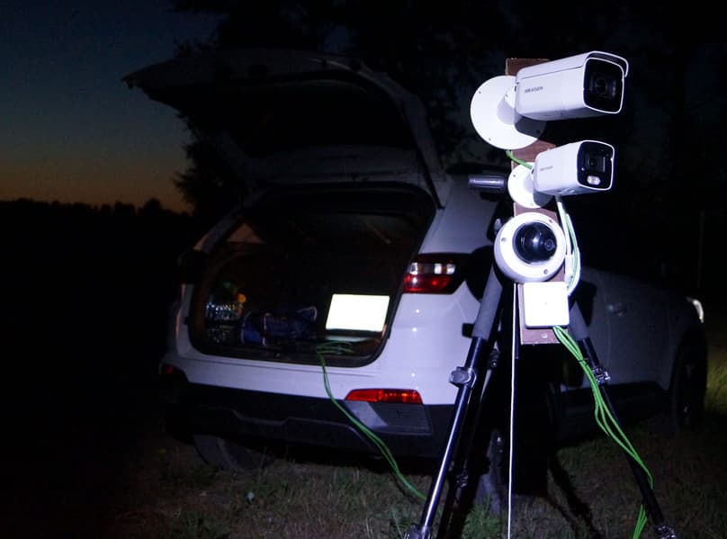 Во время тестирования площадка с камерами неоднократно меняла место жительства. То есть работы. В поисках подходящих локаций мы подвешивали камеры к торцу бетонной плиты у окна городской квартиры в многоквартирном доме, на разных сторонах частного дома в небольшом городке. Даже пытались перевезти конструкцию в темные ночные поля, запитав все это хозяйство от автомобильного инвертора. К сожалению, последний трюк не удался по причине нехватки питания: 150 Вт, гордо напечатанные на инверторе (и 300 ватт пиковых), оказались пустышкой, инвертора хватило на несколько минут работы.
