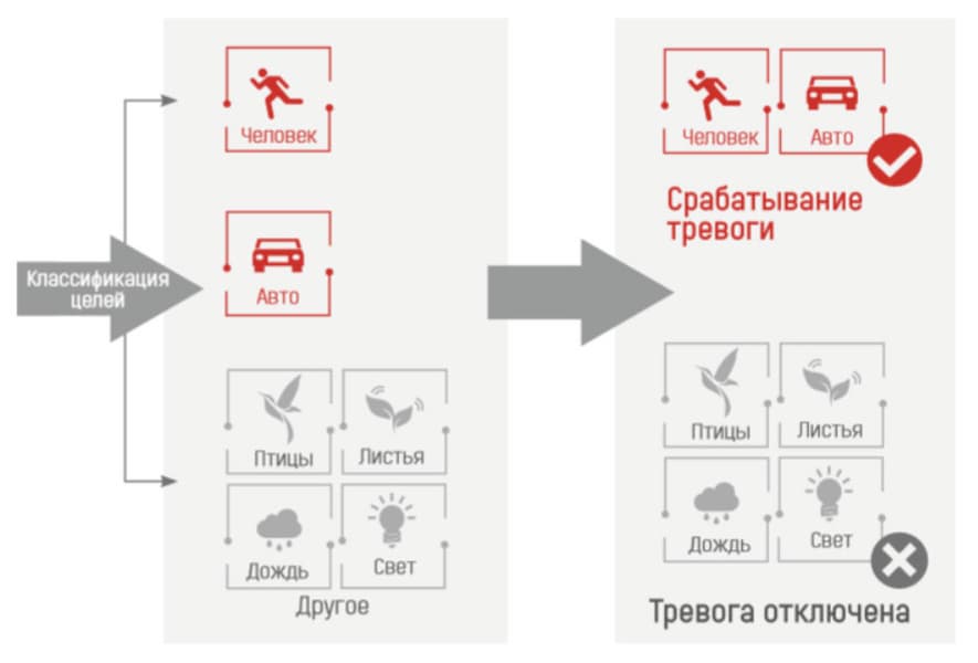 Описанные функции можно и нужно считать уникальными, и вот по какой причине. Необходимость в видеонаблюдении растет в геометрической прогрессии, с такой же скоростью увеличивается парк систем наблюдения. Но вместе с этим, подобно снежному кому, растет и масса стандартных в видеонаблюдении проблем, описать которые можно одним определением: ложные тревоги. Они исходят из банальных ситуаций, избежать которых практически невозможно. Помехами, приводящими к срабатыванию датчиков движения, могут быть солнечные блики, капли дождя, летающая пыль и пух, неизбежная паутина, колышущиеся на ветру листья, трава и даже пролетающие в кадре птицы. Все эти факторы генерируют огромное количество ненужной, ложной информации, и, как следствие, приводят к колоссальному снижению эффективности тревожной сигнализации.