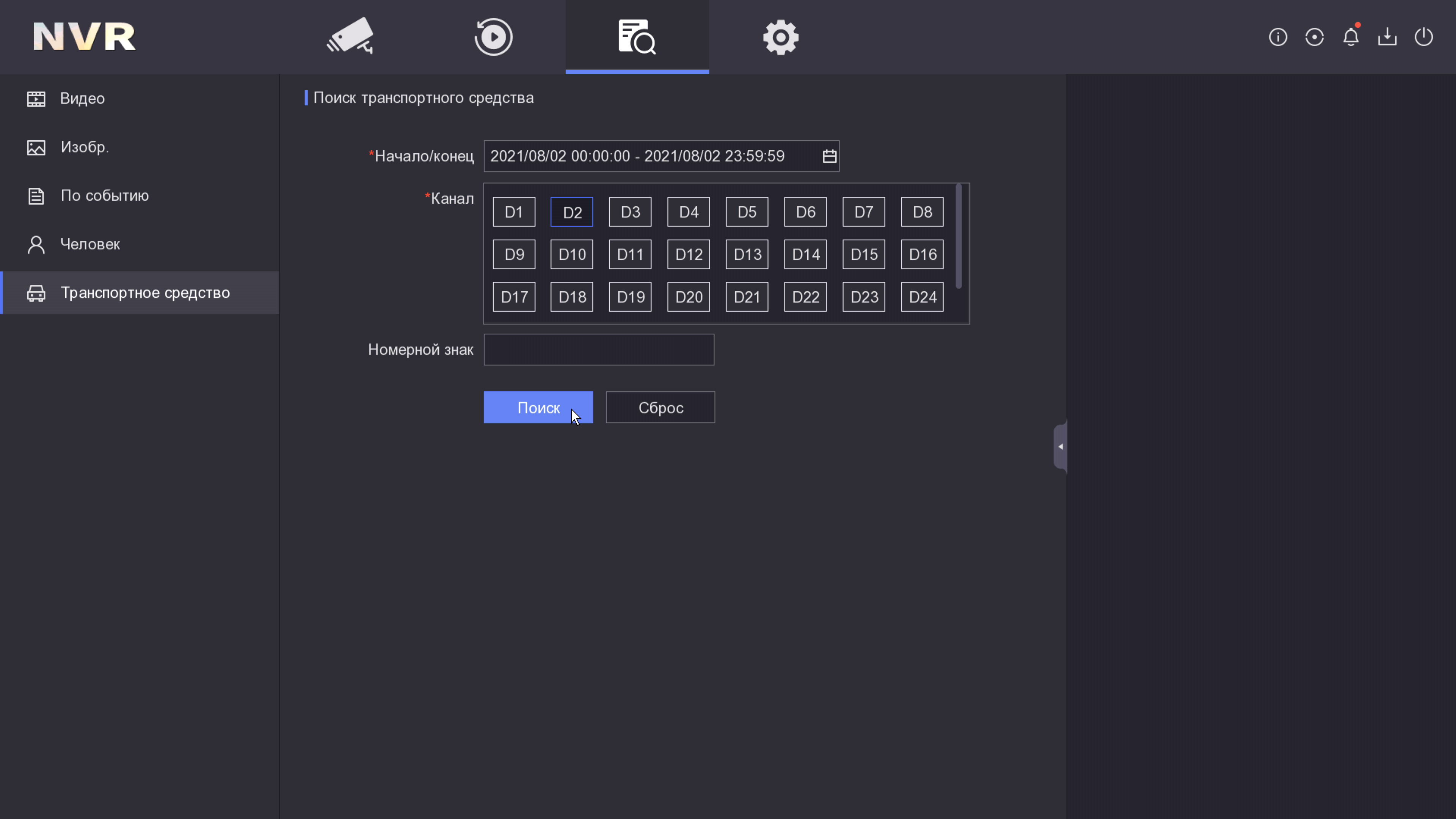 Отдельно организован поиск транспортных средств и людей, попавших в кадр. Этот поиск работает так же быстро, как описанный поиск по типу событий.