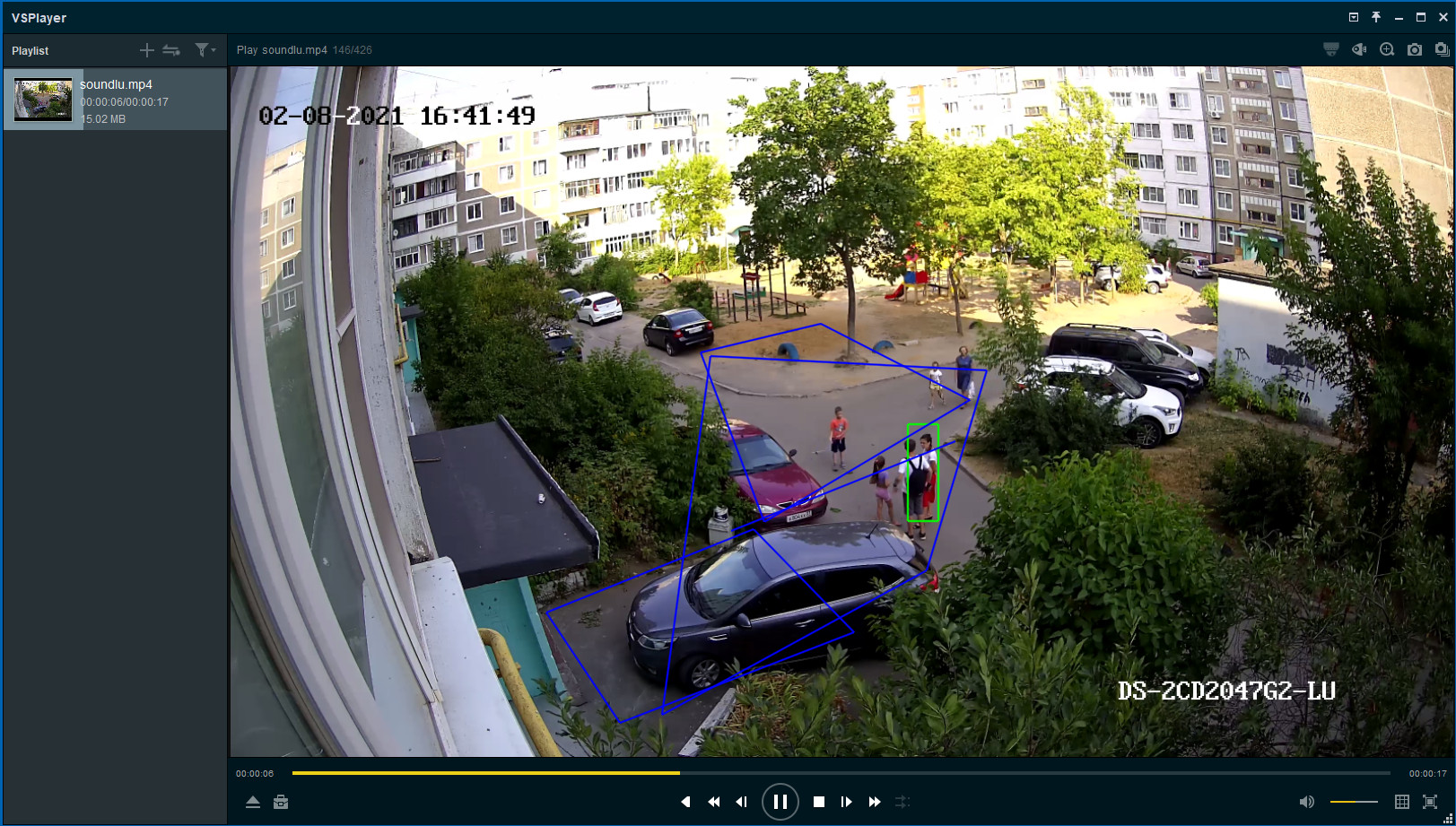 Правда, со звуком — вопросы. Однако при воспроизведении роликов на ПК вместо звука слышны какие-то шумы и помехи. Оказывается, такова особенность фирменного сжатия. Для комфортного просмотра видео, записанного камерами и регистратором Hikvision, рекомендуется использовать фирменную программу VSPlayer, вместе с которой устанавливаются еще несколько сопутствующих приложений. Но на чистом выводе звука ее удивительные способности не оканчиваются. Оказалось, что этот плеер еще и отрисовывает оверлейные линии охранных зон и даже обнаруженные объекты, забирая нужную информацию прямо из видеофайла. Чудеса.