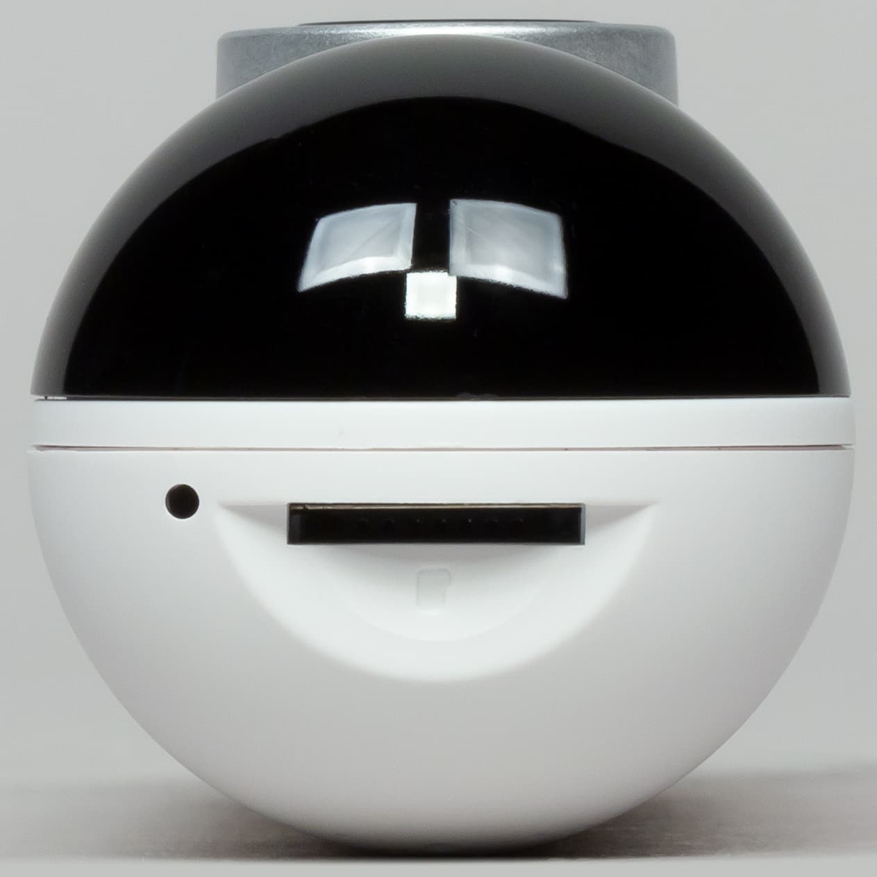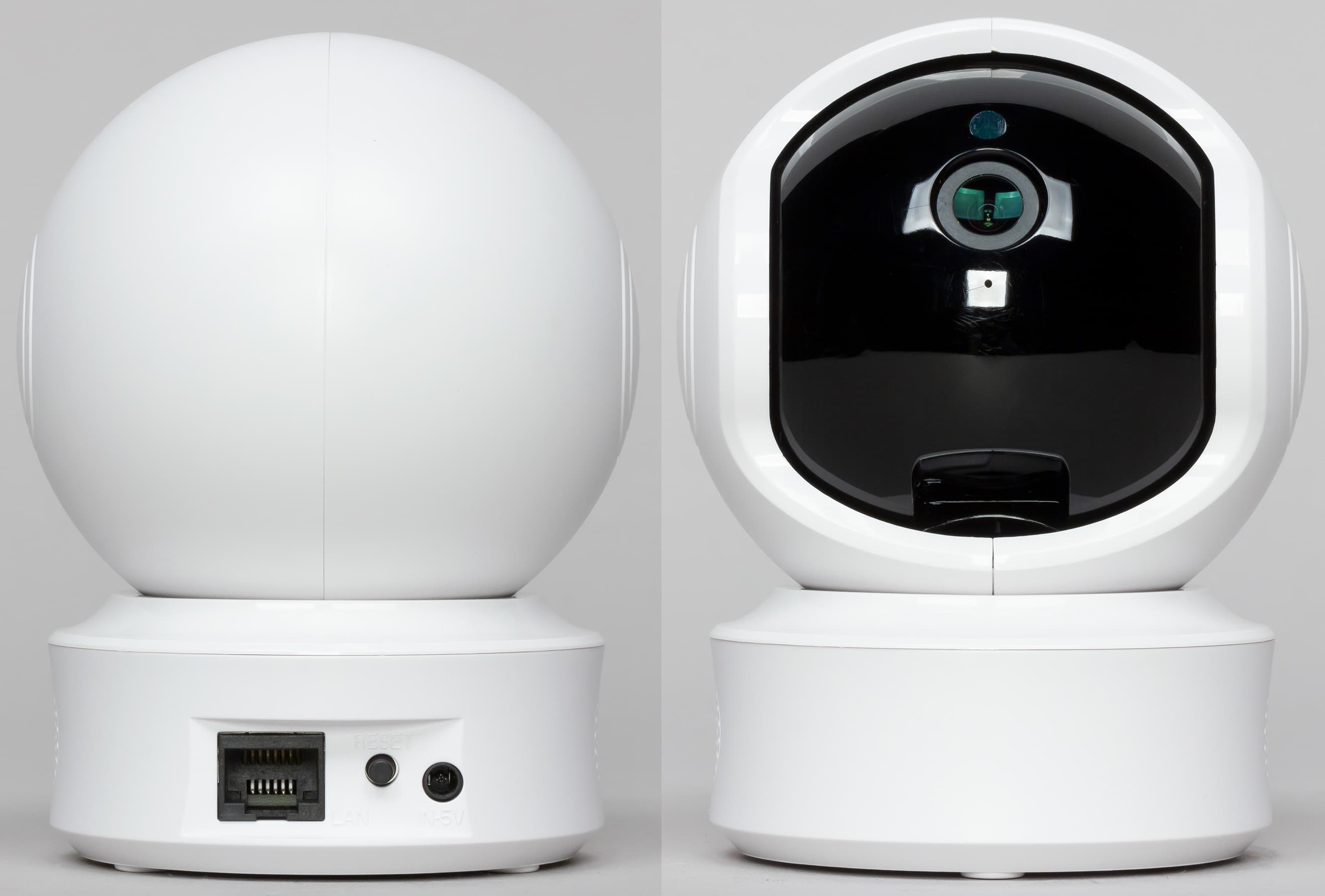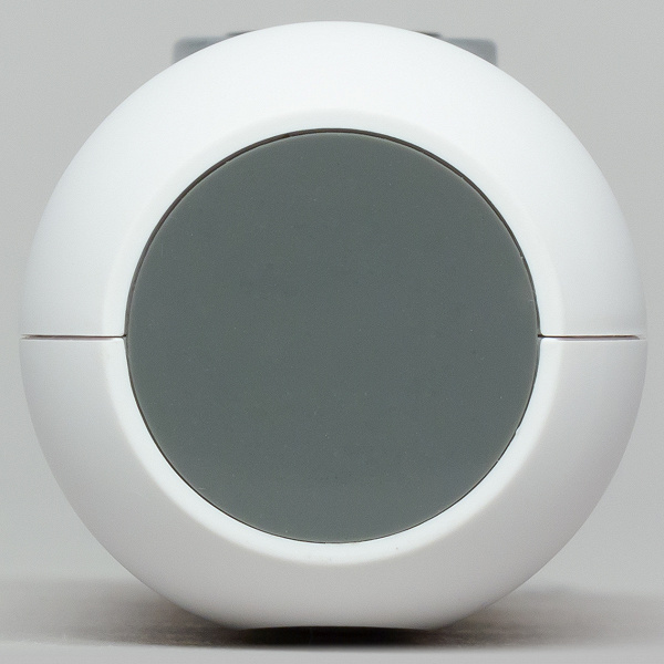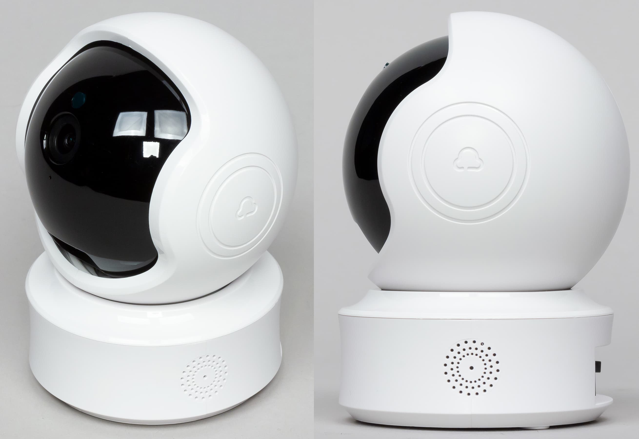 «Старшая» модель получила корпус, состоящий из трех частей — массивного основания, поворотной секции (обеспечивает вращение в горизонтальной плоскости) и находящегося внутри нее шарообразного блока с камерой (отвечает за вертикальное перемещение). По бокам основания видны отверстия встроенных динамиков.