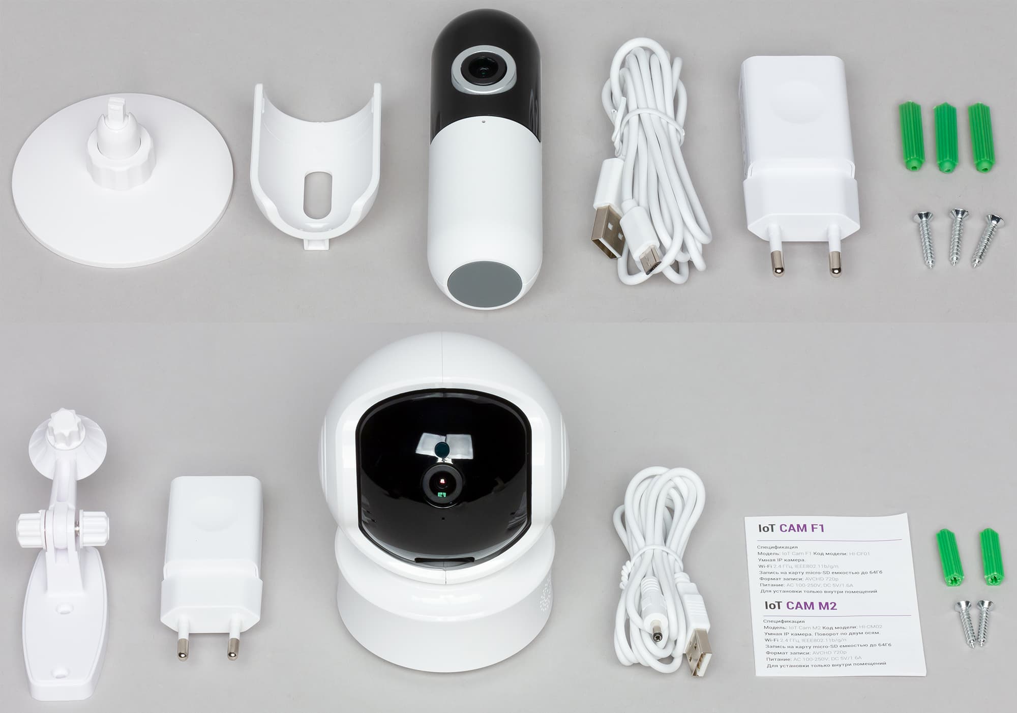 Комплект поставки практически одинаков: сама камера, штатив-кронштейн, двухметровый кабель для зарядки, блок питания, краткая инструкция (русский язык присутствует) и набор для крепежа. Об отличиях поговорим в следующей главе.