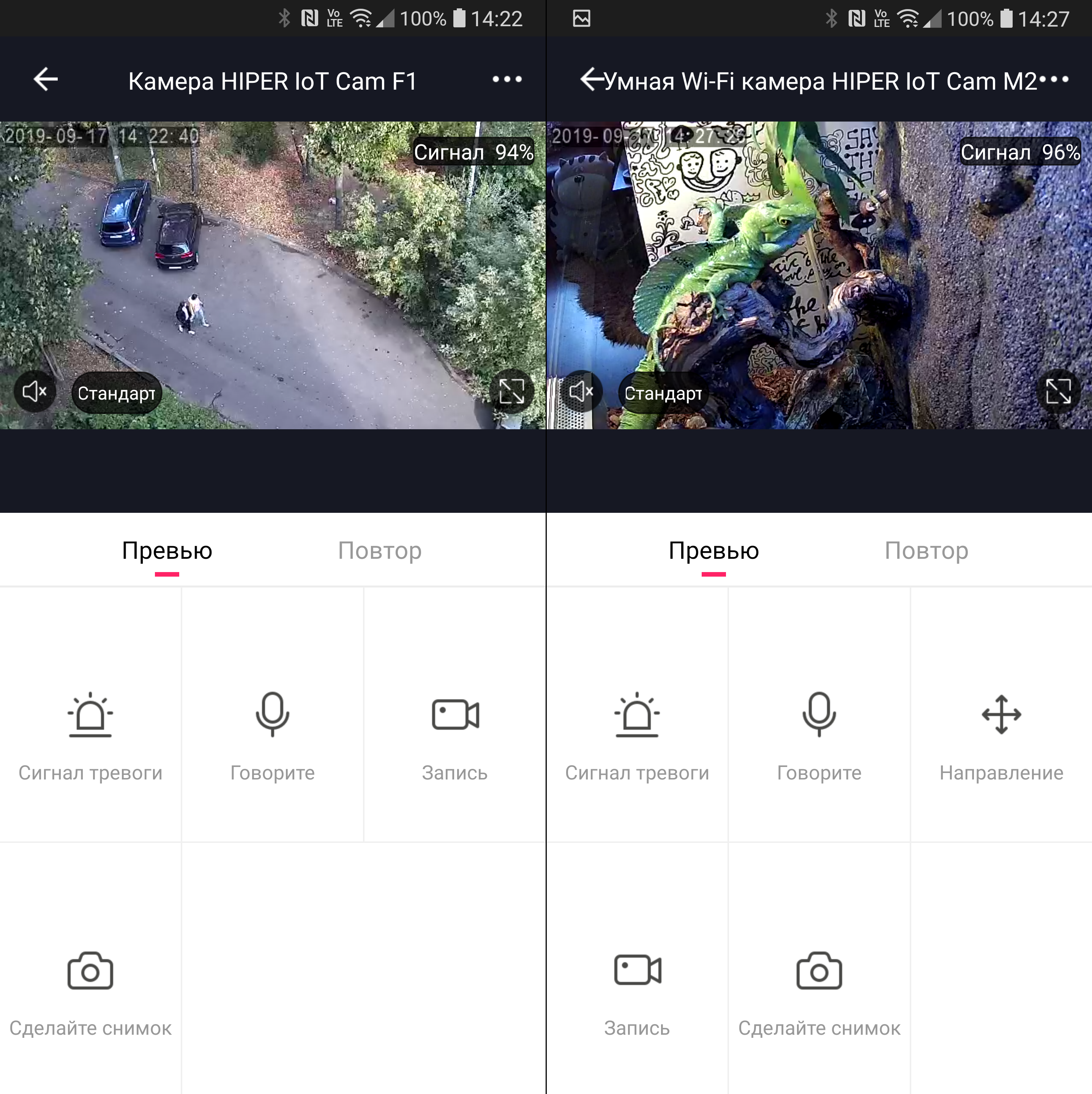 Интерфейс приложения при работе с обеими камерами практически идентичен. У «старшей» модели добавляется вкладка — «Направление», на которой можно управлять движением камеры. Рассматривать приложение мы, естественно, будем на примере устройства с бо́льшим количеством функций. На вкладке просмотра онлайн-потока можно переключать разрешение видео и включать/выключать трансляцию звука с микрофона камеры, а также контролировать качество ее подключения к сети.