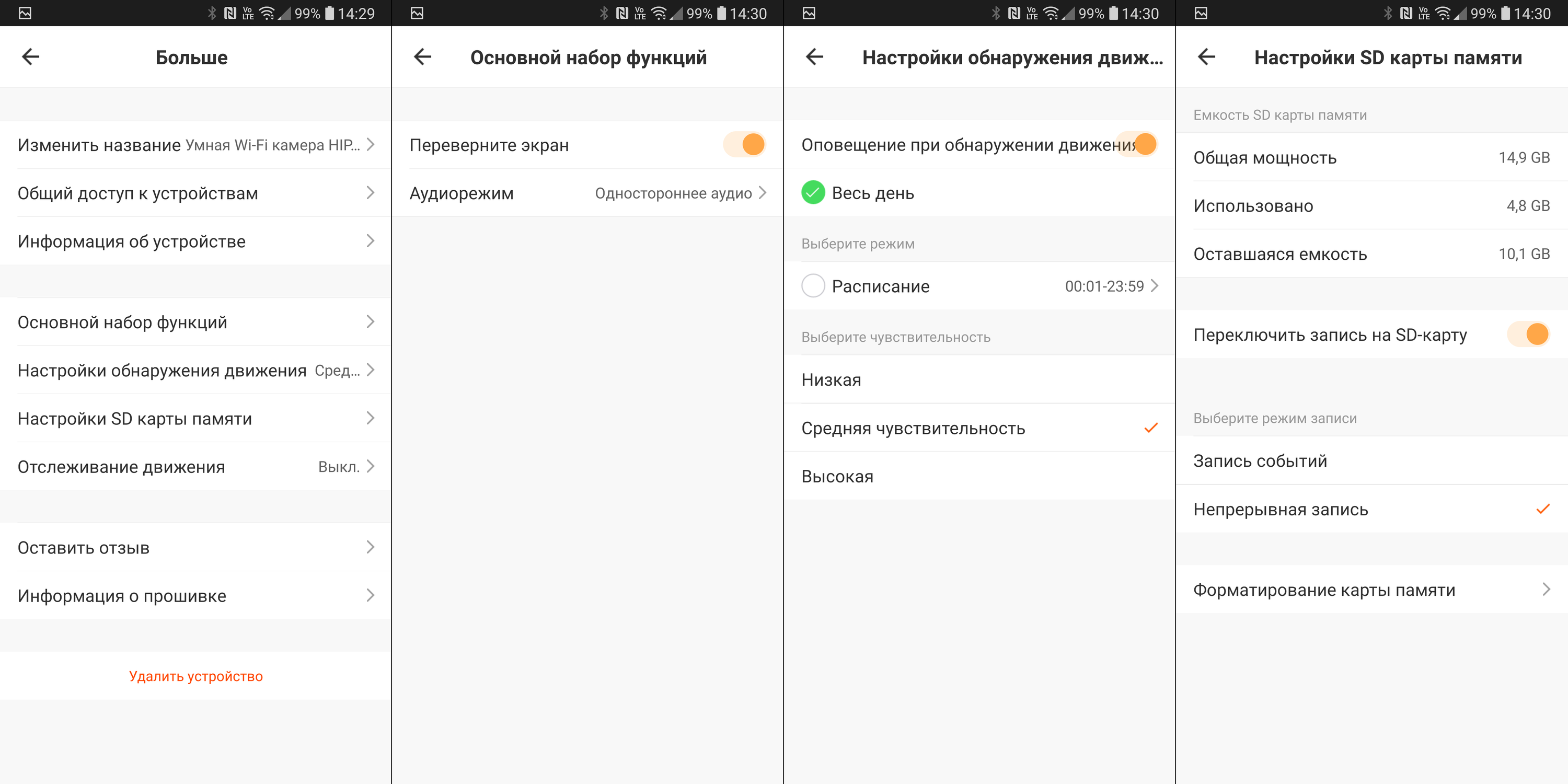 Для начала перейдем на страницу настроек (стандартная кнопка с тремя точками в верхнем правом углу). Здесь мы можем перевернуть видео, если камера закреплена к потолку, а также изменить аудиорежим. Еще одна вкладка позволяет настроить чувствительность датчика движения, а также включить оповещение при обнаружении движения.