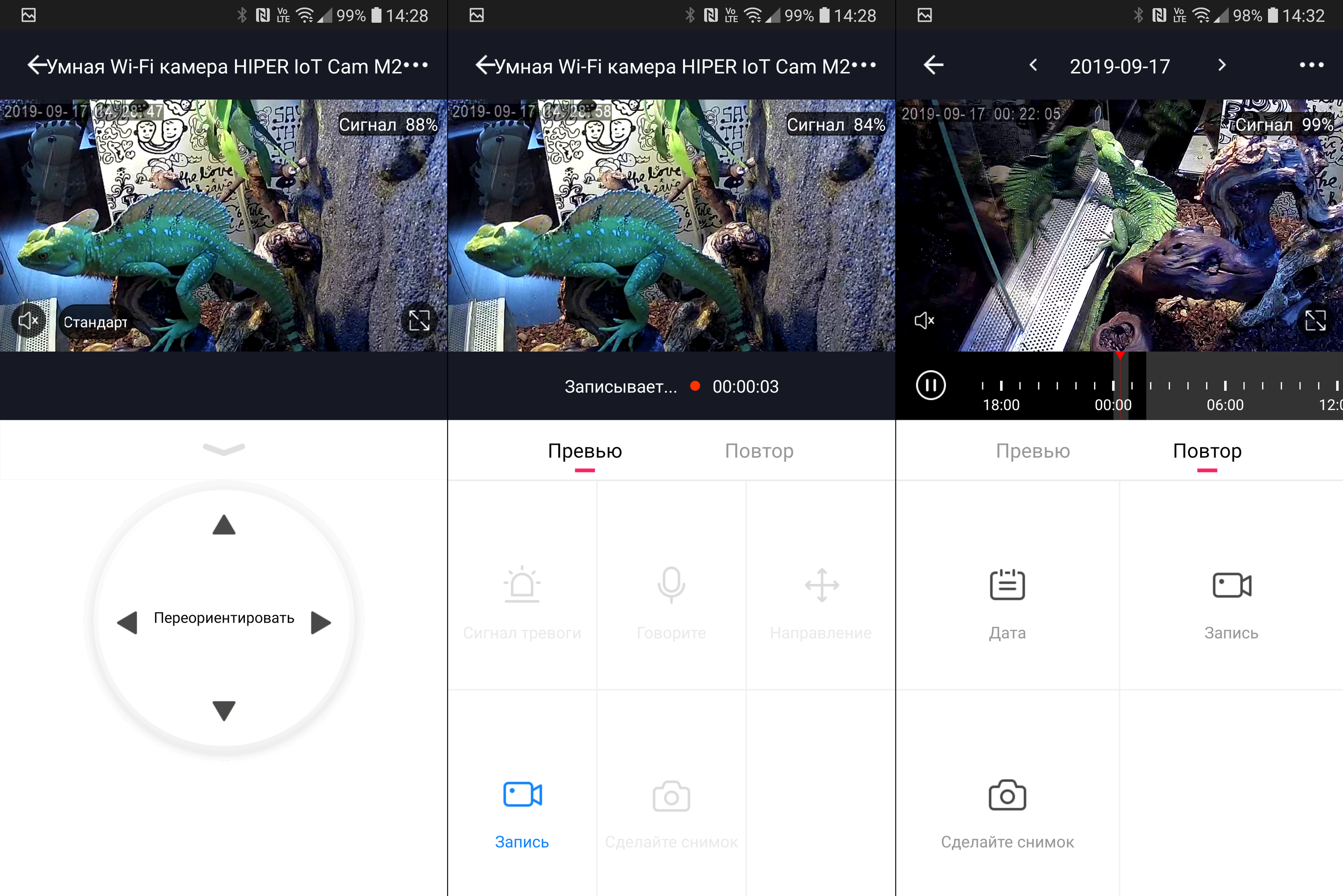 Ну и последняя по порядку, но далеко не по значимости вкладка приложения — «Повтор». Служит она для доступа к архиву. На ней пользователь также видит потоковое видео с камеры, но идет оно не в онлайн-режиме, а с карты памяти. С помощью таймлайна внизу можно выбирать нужное время, с помощью кнопки «Дата» — выбирать день. Серым на таймлайне отмечено время, для которого есть видео — при включенном режиме записи событий сразу видно, когда срабатывала камера.