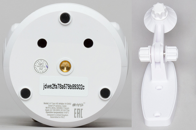 На дне камеры расположены противоскользящие ножки, а также крепление для кронштейна. Крепление стандартное — с резьбой 1/4″, что позволяет размещать камеру на штативах. Кронштейн имеет одну степень свободы, плюс основание камеры при установке на площадку для крепления можно повернуть на любой угол.