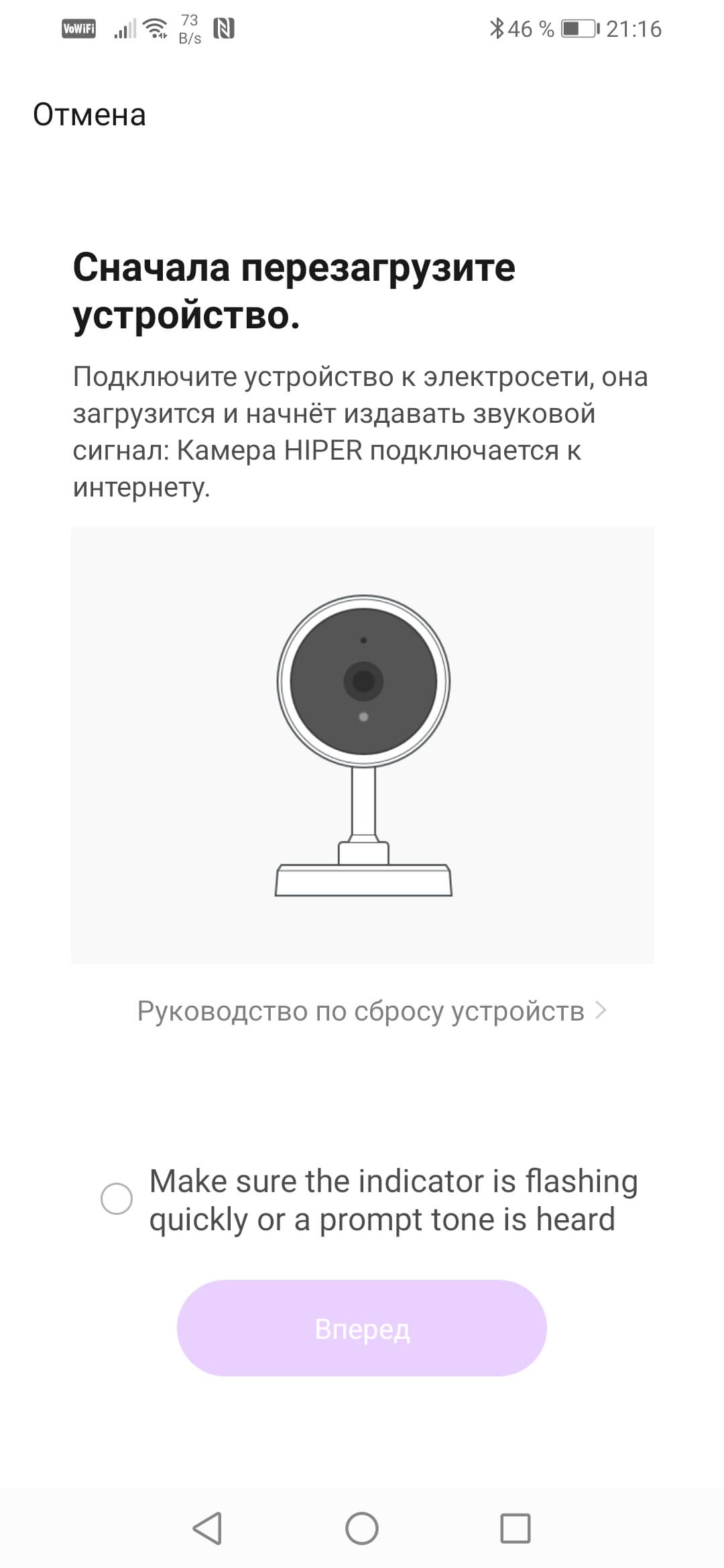 Для добавления к вашей учетной записи камеры нужно снять с нее верхнюю крышку, нажать и удерживать кнопку сброса. Через несколько секунд камера по-русски сообщит о сбросе и последующей перезагрузке. Теперь пора запускать приложение, где нужно нажать иконку с плюсом, находящуюся в правом верхнем углу стартовой страницы. В появившемся списке устройств Hiper надо отыскать раздел Камера, и выбрать интересующую модель. Она последняя в этой таблице. На следующем шаге приложение создаст и отобразит на экране смартфона особый QR-код, в котором зашифрованы данные для подключения к Wi-Fi точке. К той самой, к которой сейчас подключен смартфон. Достаточно показать камере этот код, и подключение будет осуществлено в течение нескольких десятков секунд. При этом каждый этап подключение озвучивается камерой по-русски.