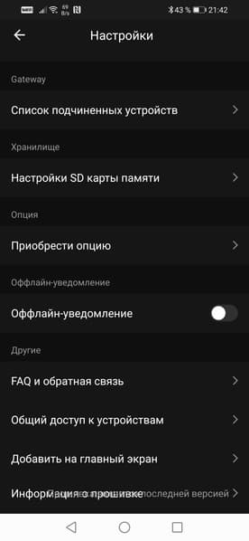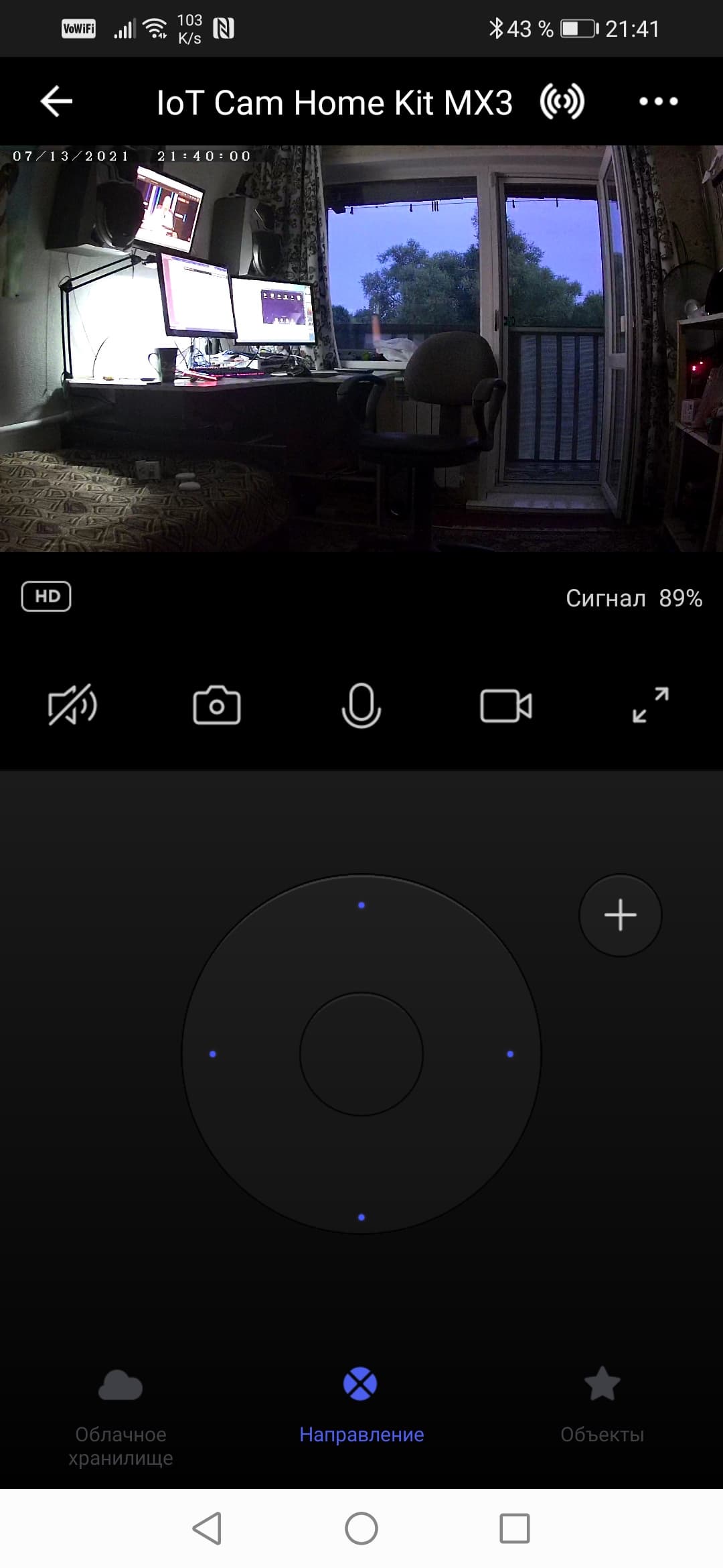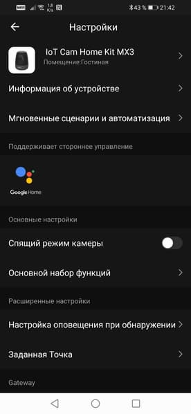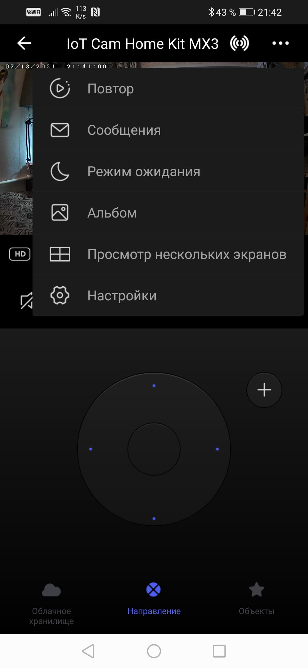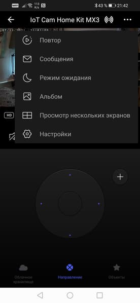 Прежде, чем подключать датчики, рассмотрим возможности и настройки этой камеры. Благо, они не настолько объемны, чтобы в них заплутать. Главное стартовое окно камеры содержит видеопоток с камеры, несколько иконок вызова быстрых функций, а также виртуальный джойстик, стрелками которого можно поворачивать объектив. Дополнительные функции прячутся в выпадающем меню, три точки которого расположены вверху справа. Стандартный набор параметров позволяет настроить метод обнаружения движения, активировать оповещения и произвести несколько дополнительных операций.