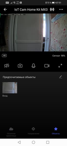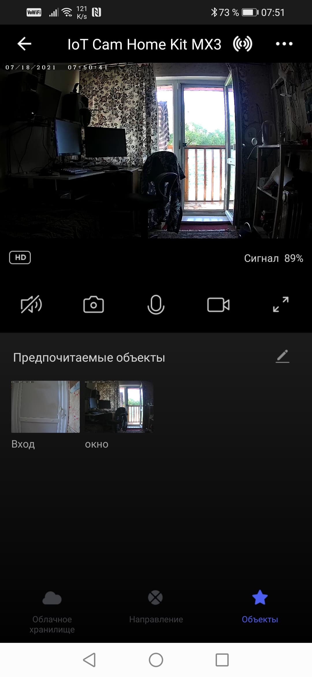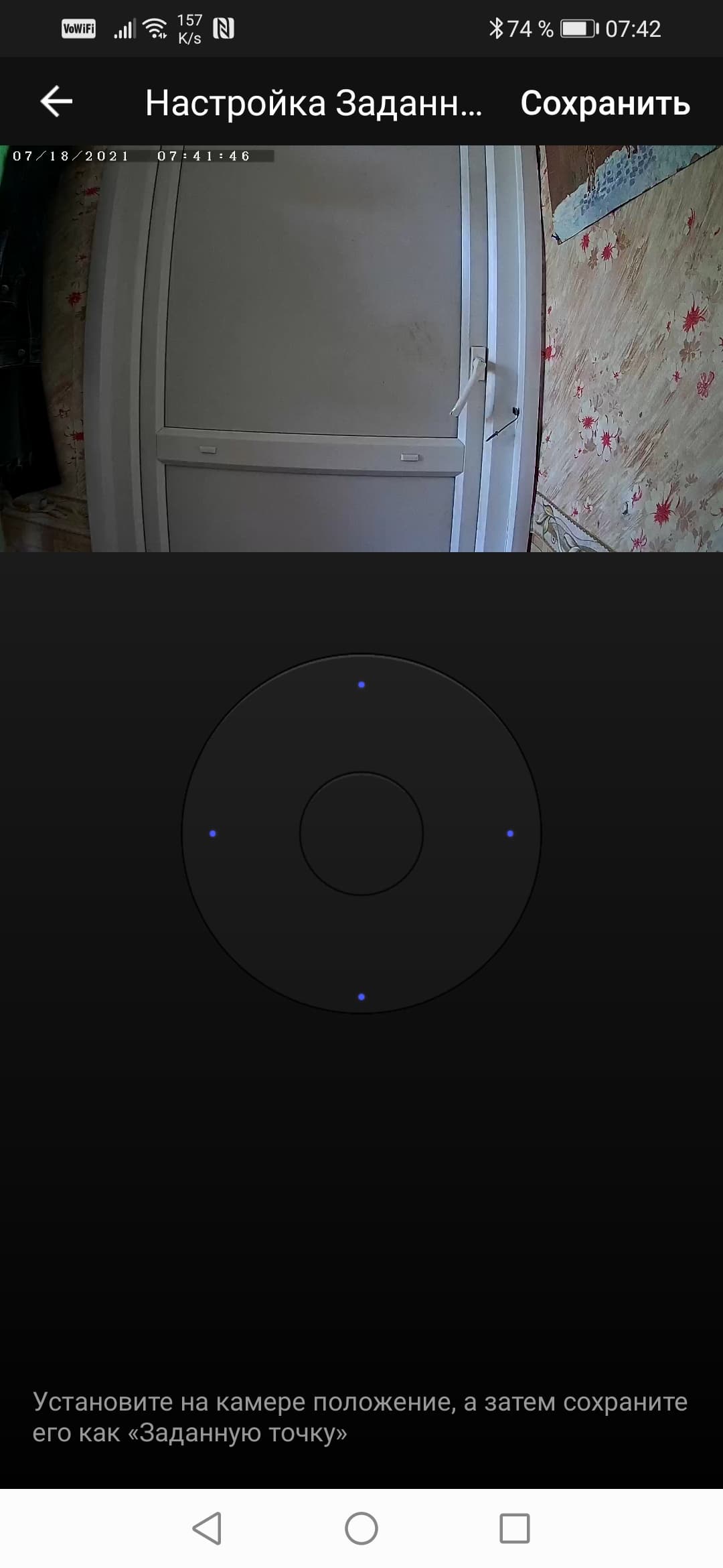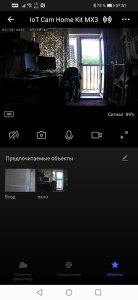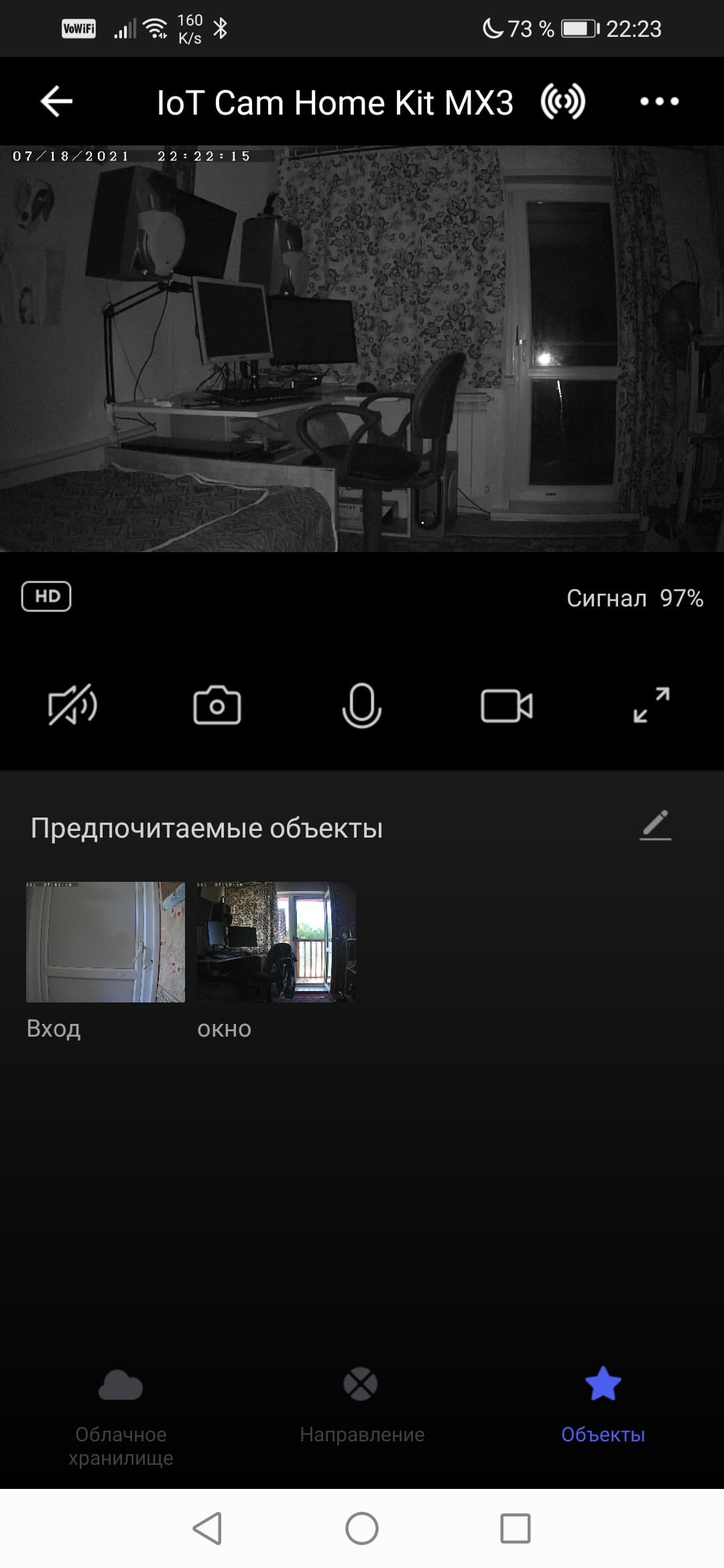 Прежде, чем подключать датчики, рассмотрим возможности и настройки этой камеры. Благо, они не настолько объемны, чтобы в них заплутать. Главное стартовое окно камеры содержит видеопоток с камеры, несколько иконок вызова быстрых функций, а также виртуальный джойстик, стрелками которого можно поворачивать объектив. Дополнительные функции прячутся в выпадающем меню, три точки которого расположены вверху справа. Стандартный набор параметров позволяет настроить метод обнаружения движения, активировать оповещения и произвести несколько дополнительных операций.